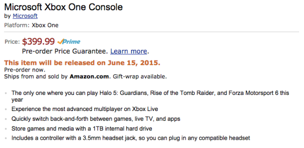 De webwinkel leverde de spelcomputer vanaf 15 juni, de dag waarop Microsoft zijn E3-conferentie houdt. Naast een grotere harde schijf is deze Xbox One gebundeld met de nieuwe Xbox One-controller en Halo: The Master Chief Collection.