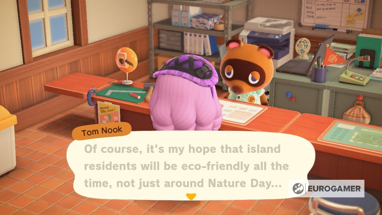 Omdat Natuurdag niet met een officiële opening van start gaat, is het een goed idee om Tom Nook bij de servicebalie op te zoeken. Hij vertelt je iets meer over het evenement en hint naar een exclusieve beloning die je alleen verdient als je aan Natuurdag meedoet.