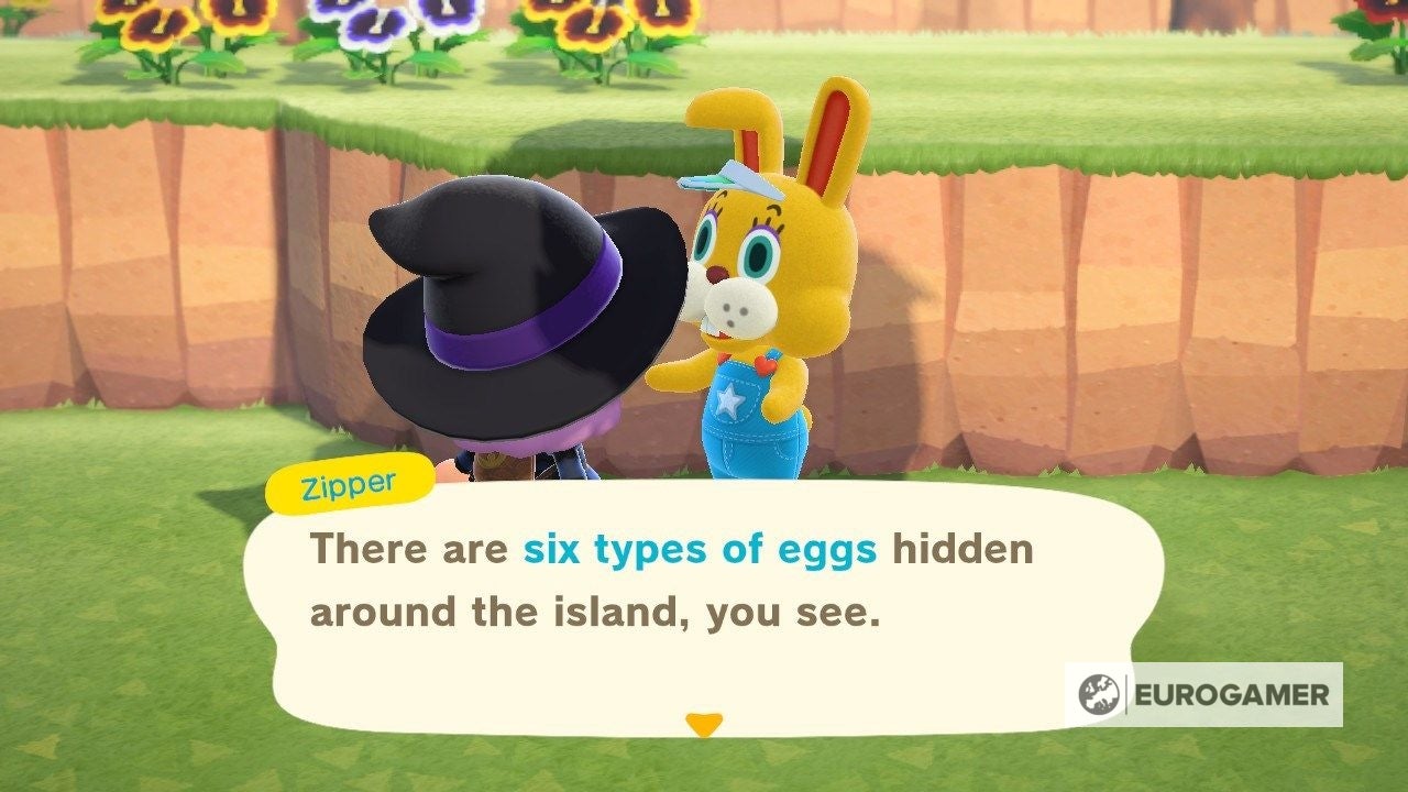 Eieren in New Horizons zijn als het ware speciale materialen waarmee je Konijnendag meubels of kleding in elkaar knutselt. Naar aanleiding van Konijnendag verstopt Zipper T. Bunny zes verschillende soorten eieren op je eiland. Nu is het aan jou om die speciale materialen te vinden en vervolgens de speciale Konijnendag-getinte meubels of kleding in elkaar knutselen.