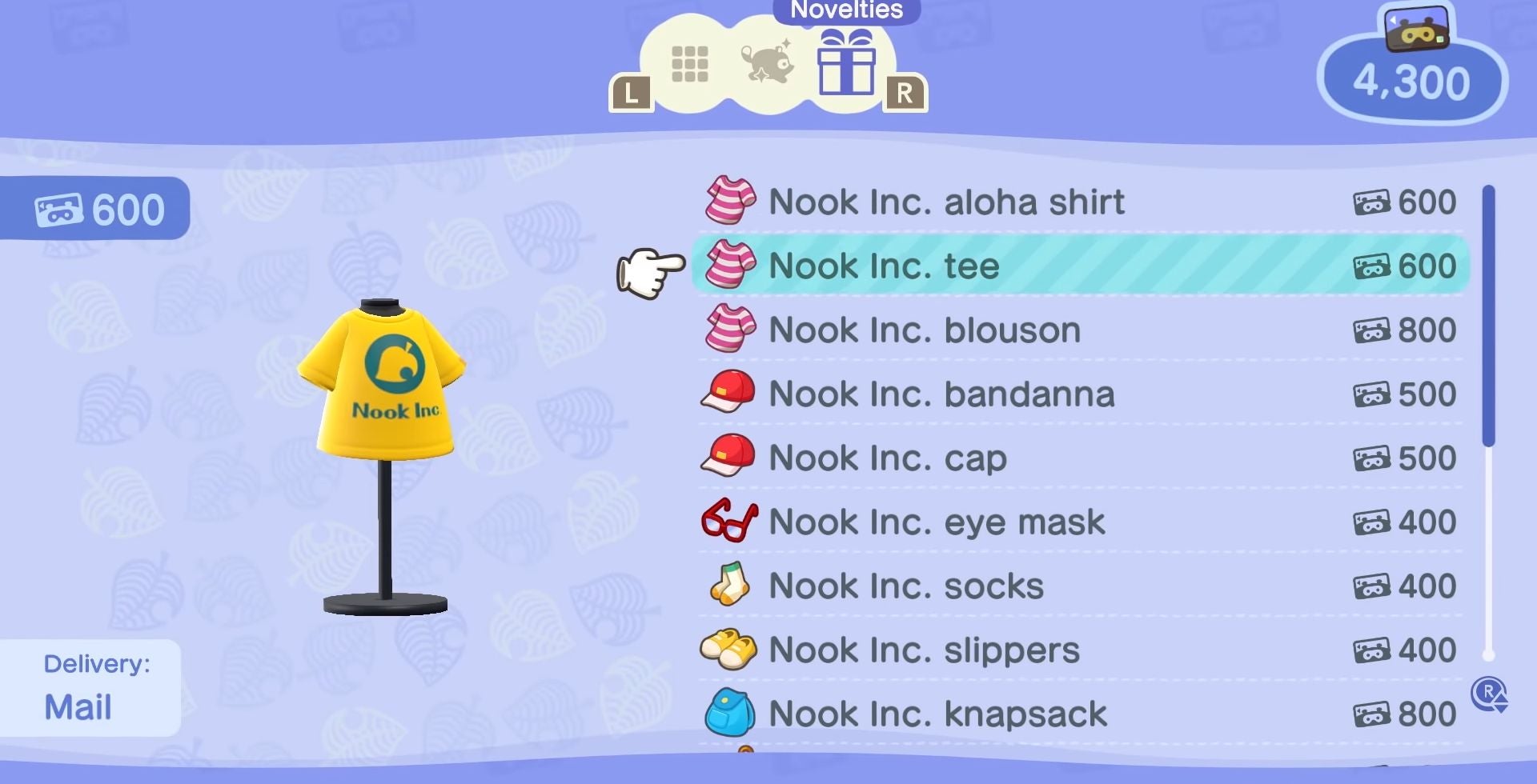 Vervolgens krijg je een lijst met alles wat er op dat moment beschikbaar is, en de hoeveelheid Nook-miles die je ervoor moet afgeven. Hier kan je naast leuke shirts ook upgrades kopen zoals een uitbreiding van je zakken, of Nook-miles bonnen waarmee je naar een ander onbewoond eiland op reis kan gaan.