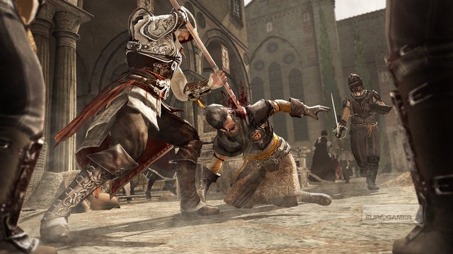 Geld is er nu ook om te verdienen, en daarbij horen een hele hoop manieren om dat uit te geven. Met je Florijnen koop je nieuwe wapens en armour, steek je je kleren in een nieuw kleurtje, of koop je health potions, begot. Het restaureren van de landelijke Auditore villa en het omliggende stadje is het kroonstuk hier. Deze tref je aan in een schandelijke staat van verval en werkt min of meer als een hub world. Van hieruit kan je te paard de open, Hyrule Field-achtige wereld in, of het nieuwe fast travel systeem gebruiken om tegen betaling naar Venetië, Firenze, Romagna en ga zo maar door te reizen.