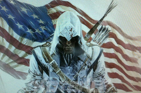 Op de foto zie je een assassin met een tomahawk, pijlen en een pistool. Boven hem zwaait de Amerikaanse vlag met 13 sterren die gebruikt werd tijdens de revolutionaire oorlog waarin de dertien Britse kolonies in de nieuwe wereld streden voor hun onafhankelijkheid van het Britse rijk.