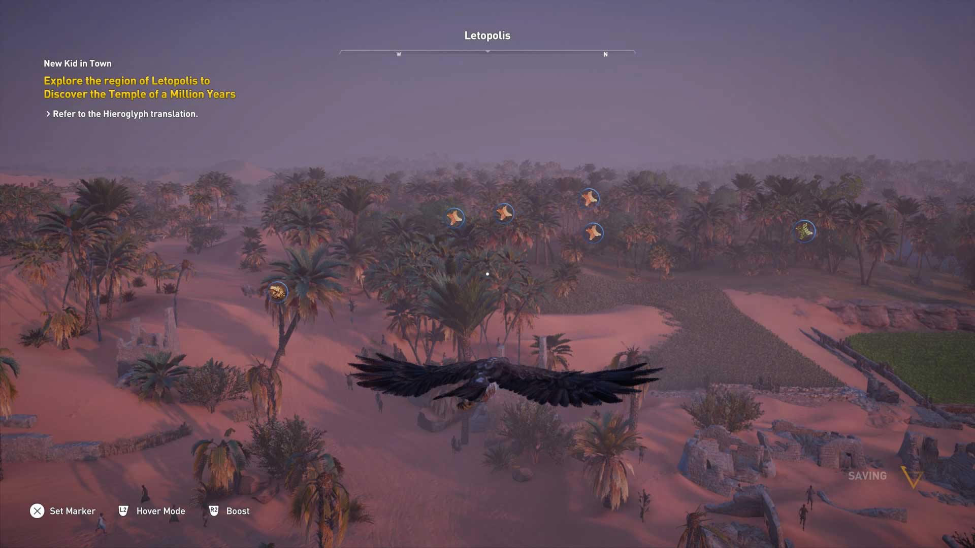 Houd de linker trekker ingedrukt om in zweefmodus te gaan. Dit maakt het makkelijker om je omgeving te scannen en vijanden, schatten en alarmen te markeren. Vervolgens zie je deze als Bayek veel makkelijker, zelfs door muren.
