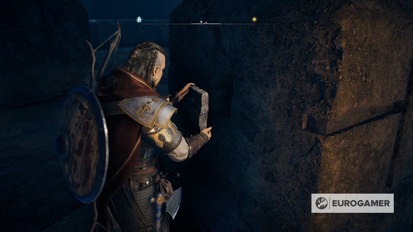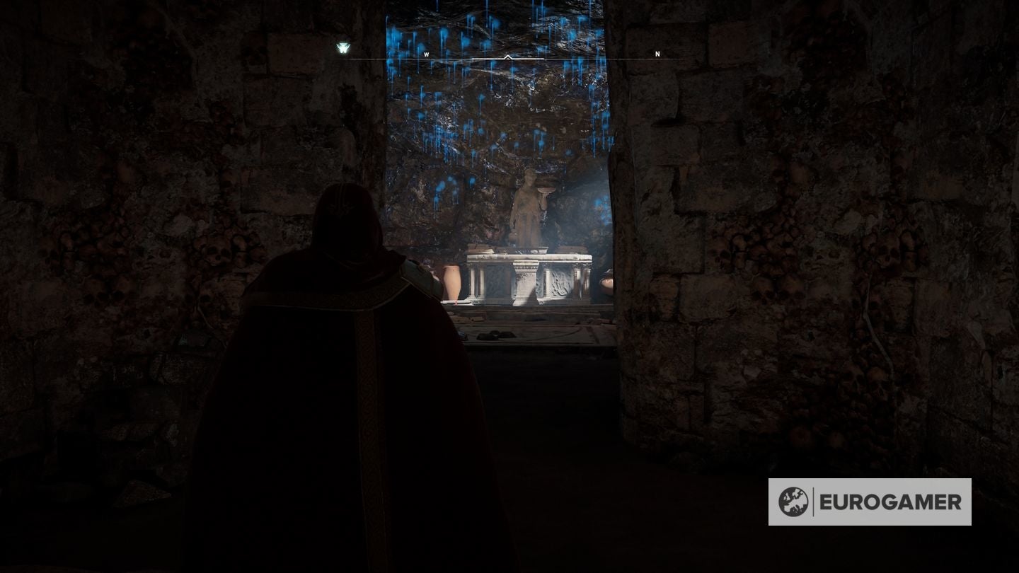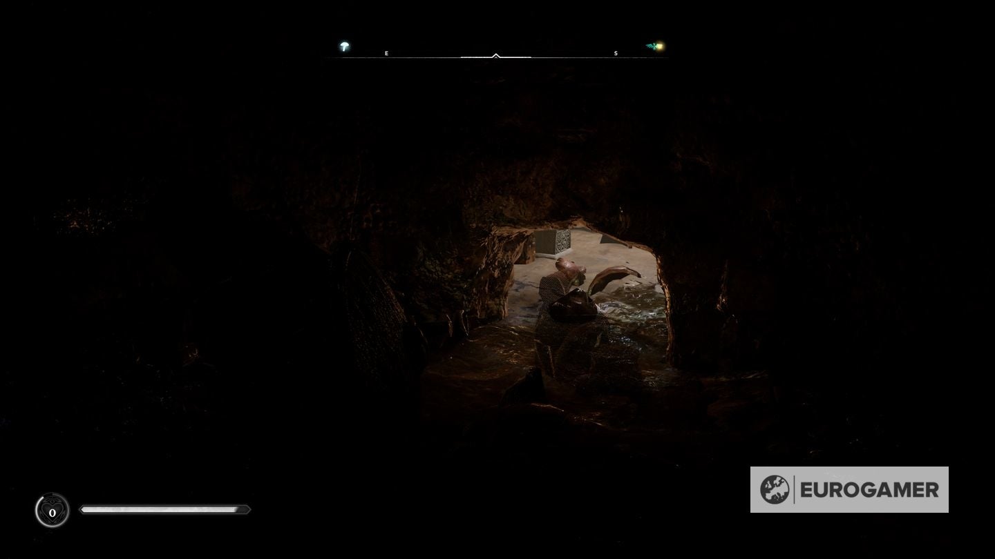 Als je eenmaal in de grot in het noordelijke deel van Snotinghamscire bent, moet je naar het bovenste platform klimmen, dat je door een spleet in de muur naar een open kamer met drie verwoeste beelden brengt.