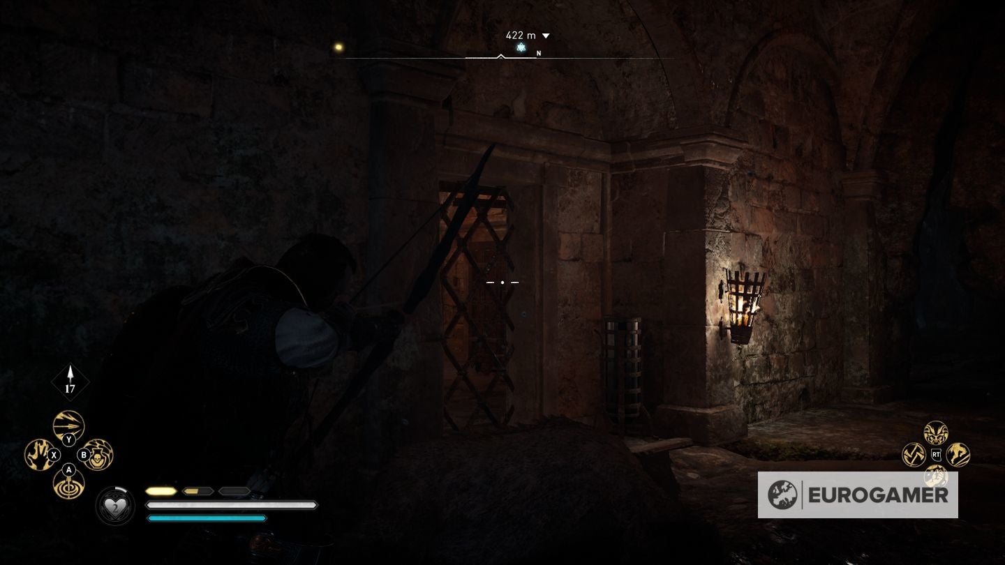 Zodra je de kelder hebt bereikt, gebruik je Odin's Sight om de sloten op de wijnvaten te markeren en erop te schieten, zodat de oude wijn het water onder het rooster doet stijgen en je zo de tablet kunt pakken.