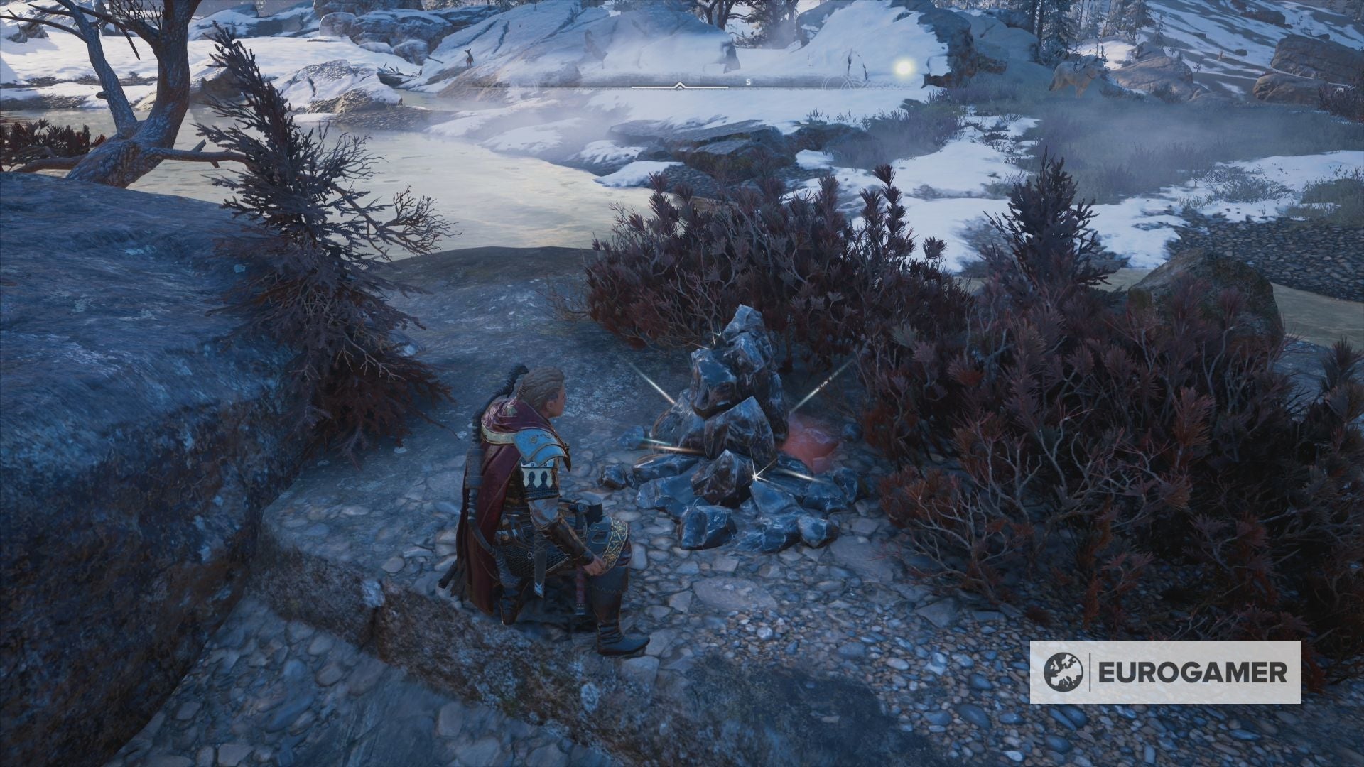 Eens je op dat eiland bent geraakt, zie je naast de struiken enkele gloeiende rotsen. Die kun je, in tegenstelling tot alle andere rotsen in de game, niet kapotslaan met je wapens in ruil voor grondstoffen. In de rots vind je namelijk de Isu bow.