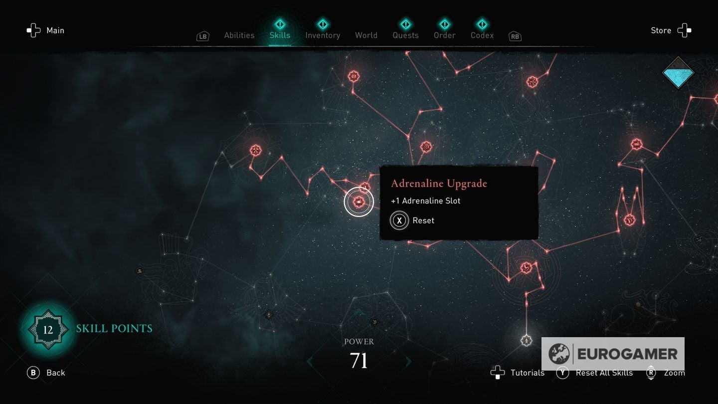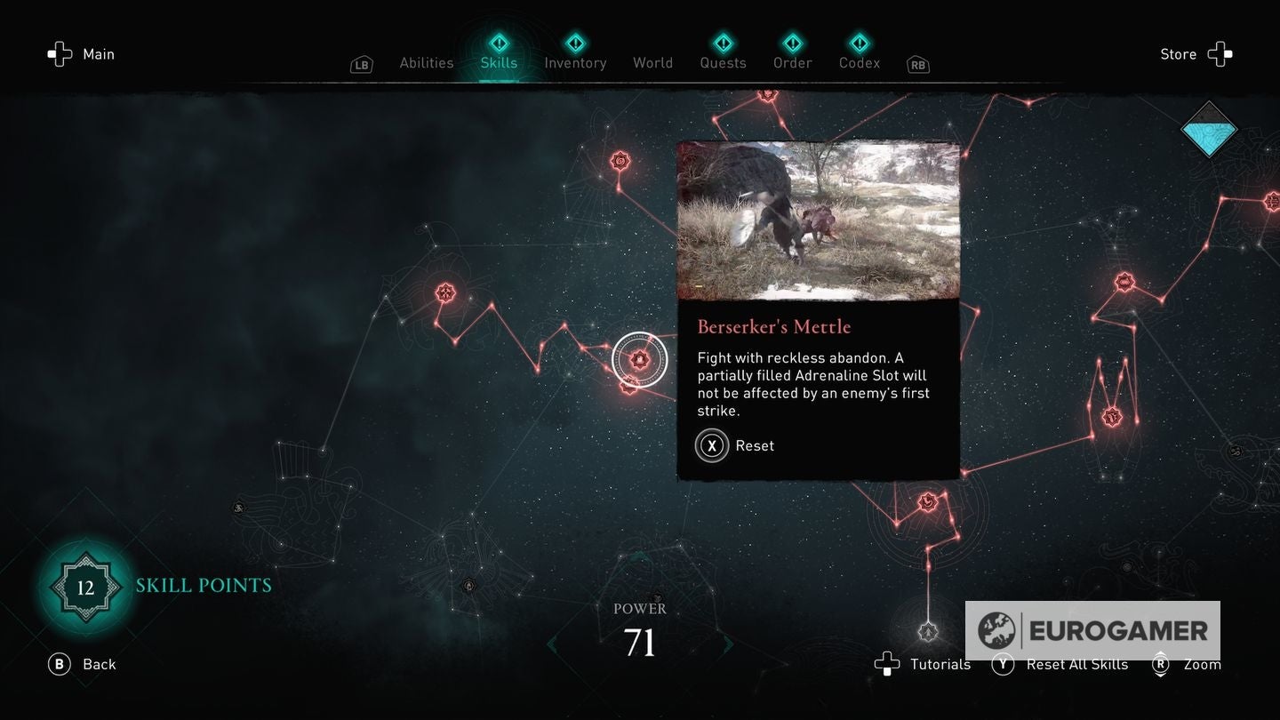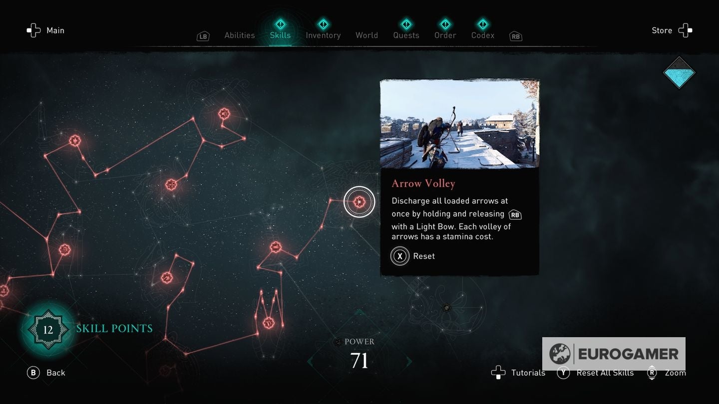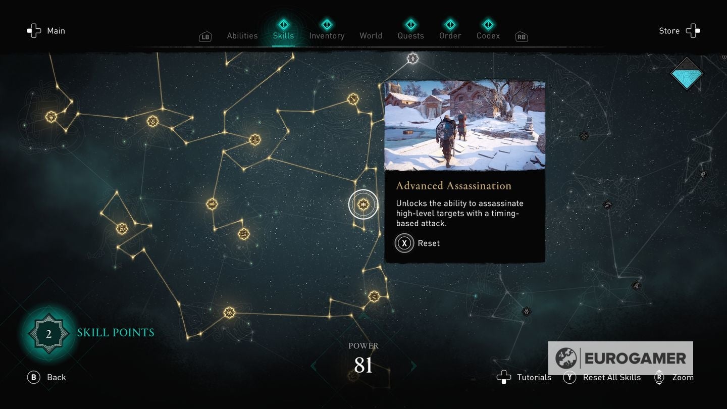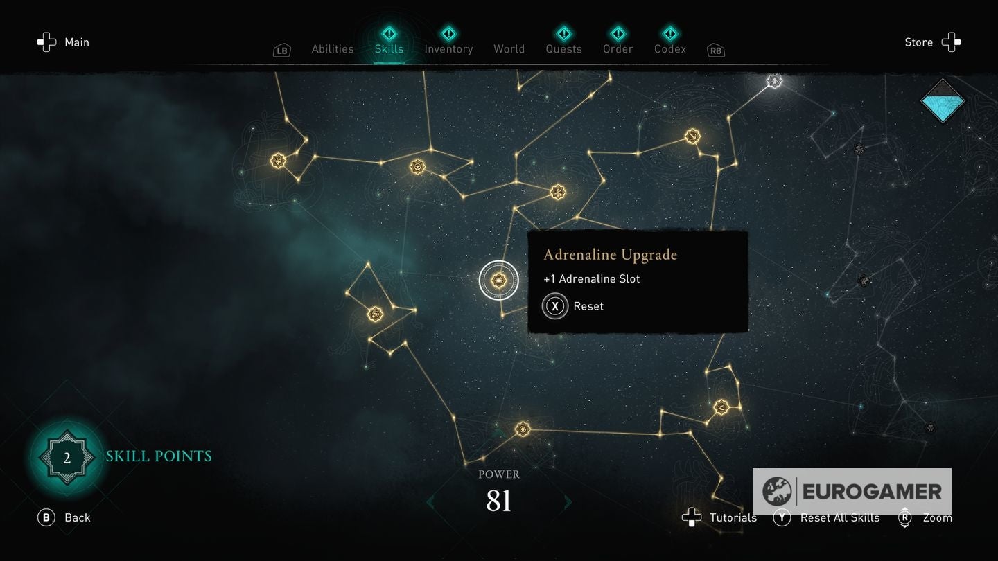 Die skill points steek je in de Skills Tree en de verschillende gevulde sections van de Skills Tree - verkrijgbaar in het main menu - worden weergegeven via Eivors Power Level. Elke Raid, Order Member en Region krijgen een voorgesteld Power Level en daarom is het om problemen vragen als je er rondloopt met een te laag level.
