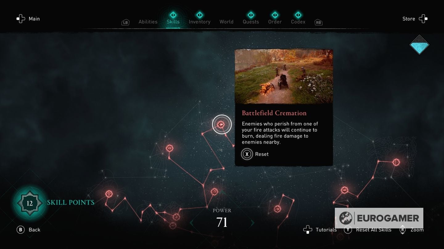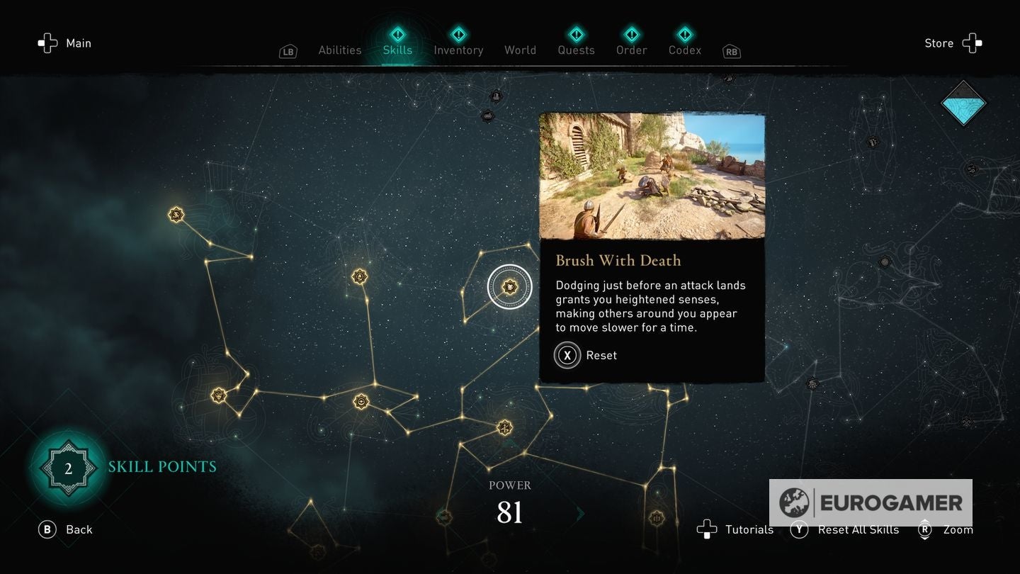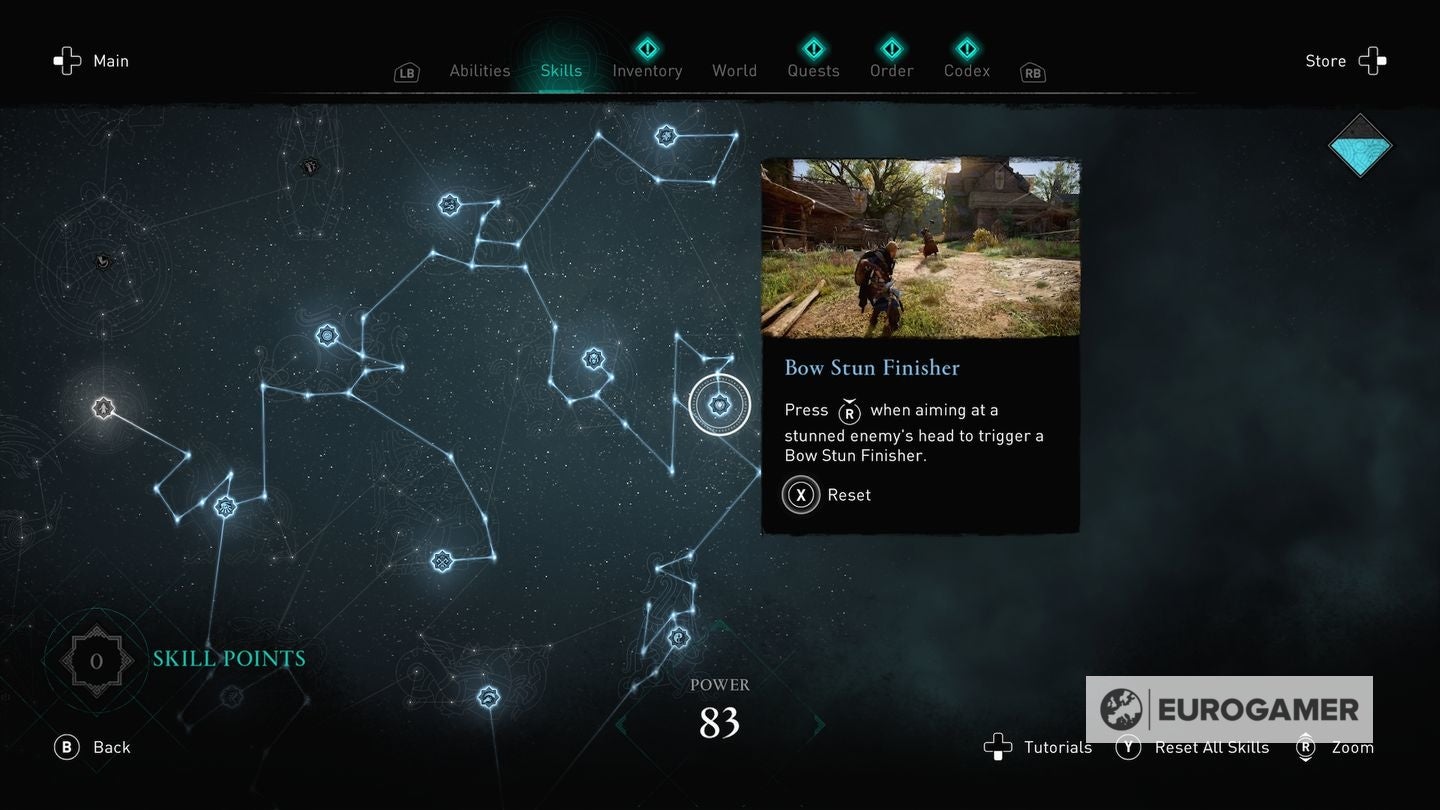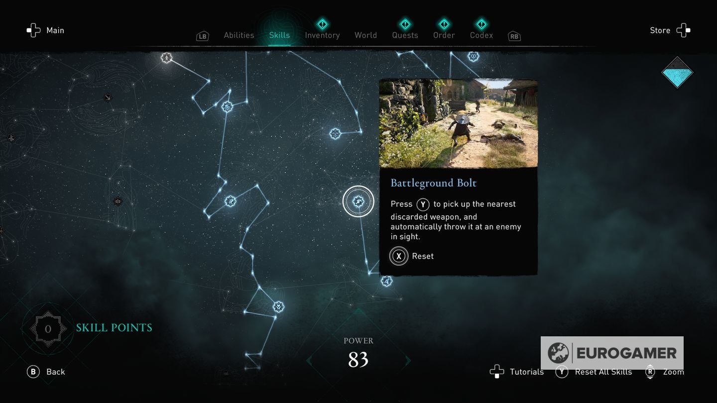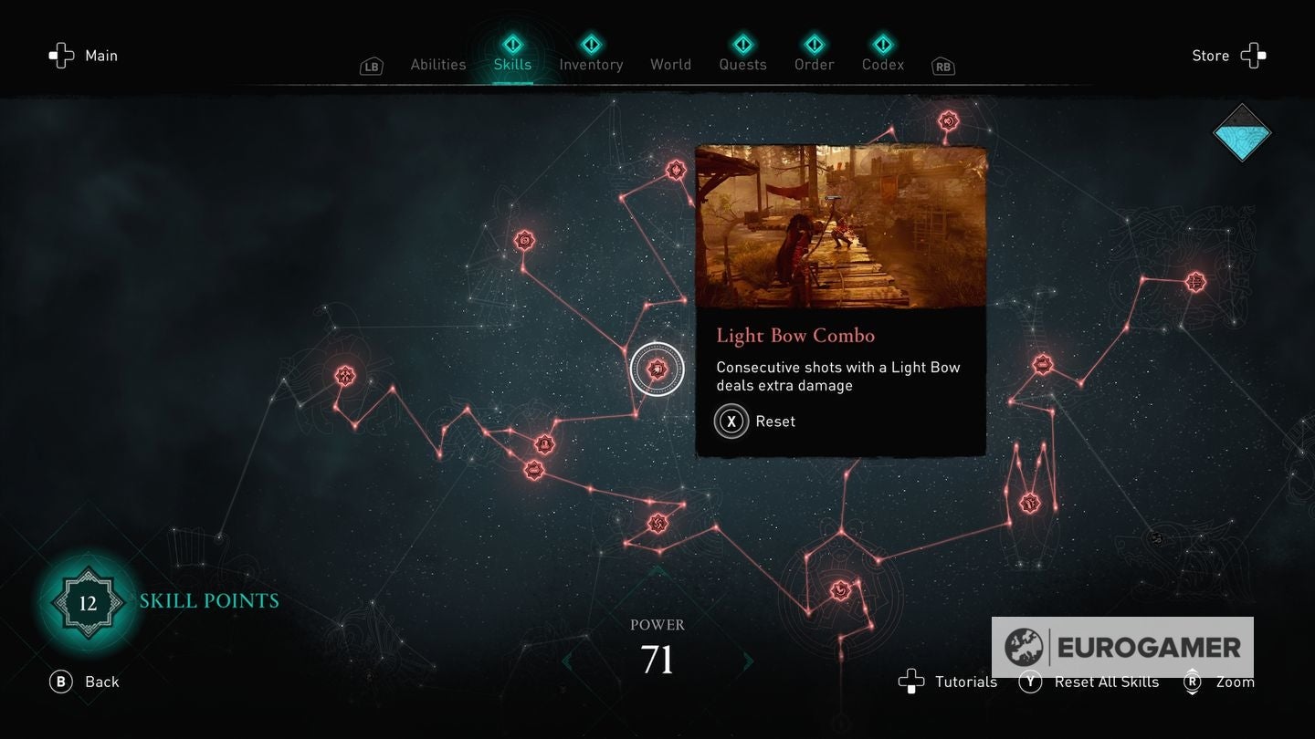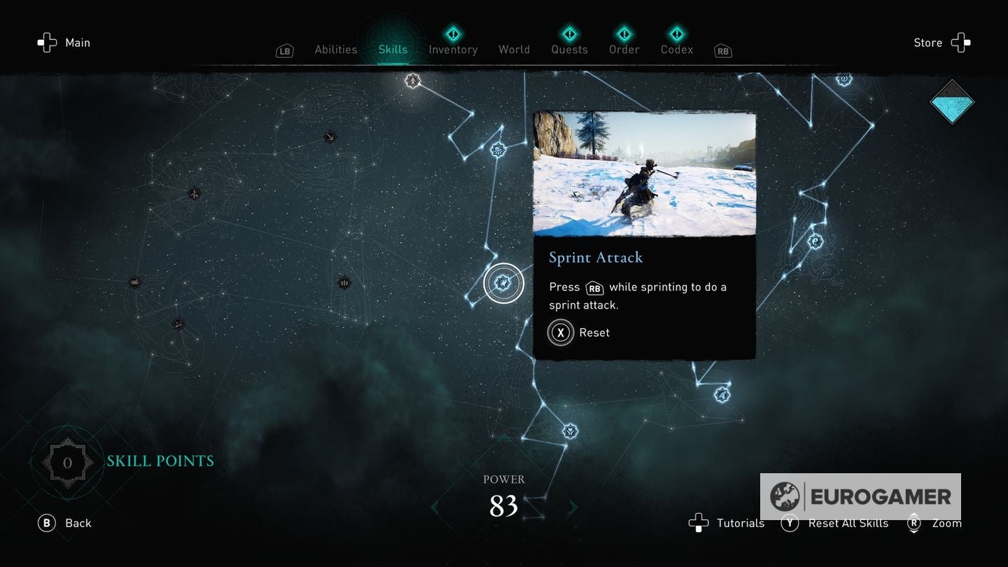 Die skill points steek je in de Skills Tree en de verschillende gevulde sections van de Skills Tree - verkrijgbaar in het main menu - worden weergegeven via Eivors Power Level. Elke Raid, Order Member en Region krijgen een voorgesteld Power Level en daarom is het om problemen vragen als je er rondloopt met een te laag level.