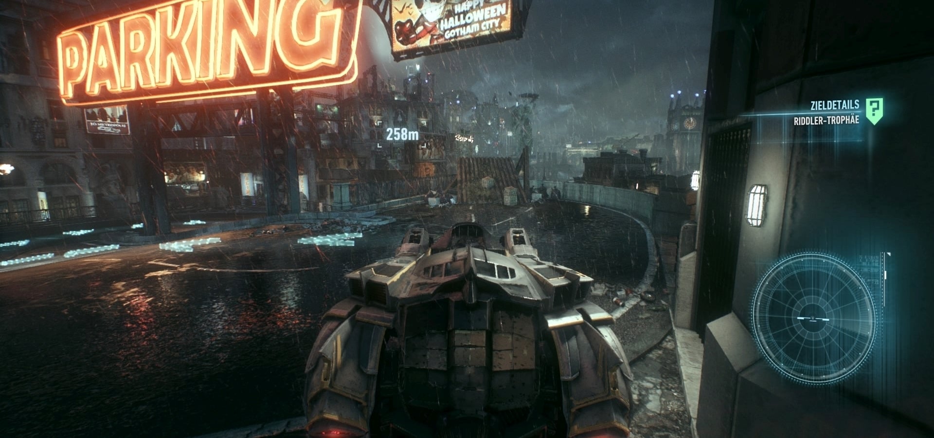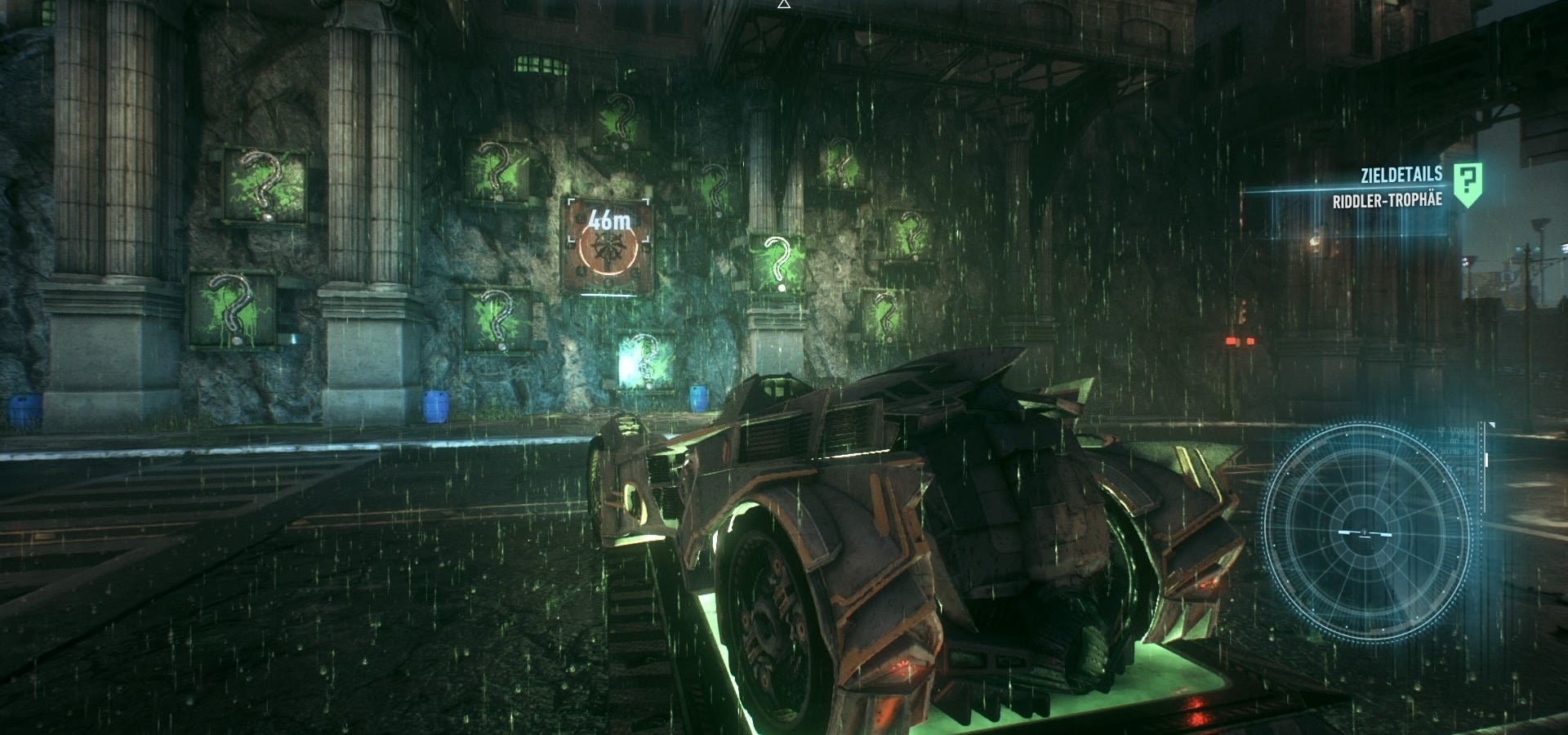 26. Rijd met de Batmobile op de onderste knop. Kijk eerst achter je en dan naar boven, gebruik de Winch en blijf daar handen. Dit punt laadt de energie van de secondary weapons op. Draai je om en schiet op de vraagtekens zodra deze verschijnen. De eerste vier raak je met een eenvoudige raket en de tweede vier ook. Daarna kleuren alle vraagtekens plotseling groen. Ram op de raketknop tot je zoveel mogelijk doelen geraakt hebt. Het vraagteken dat je niet raakt, beschiet je met de Batmobile. Grijp de trophy met de Batclaw (screenshot).