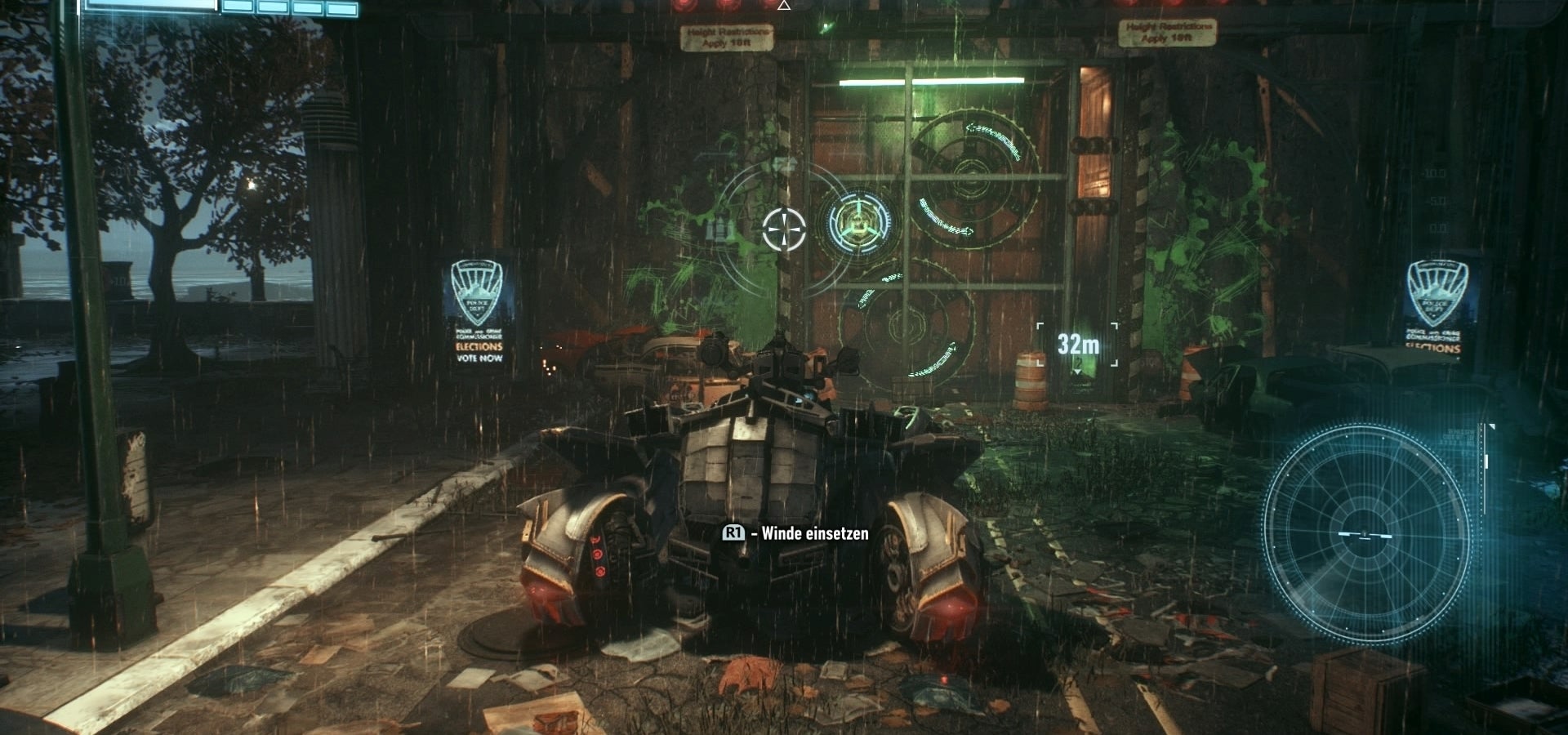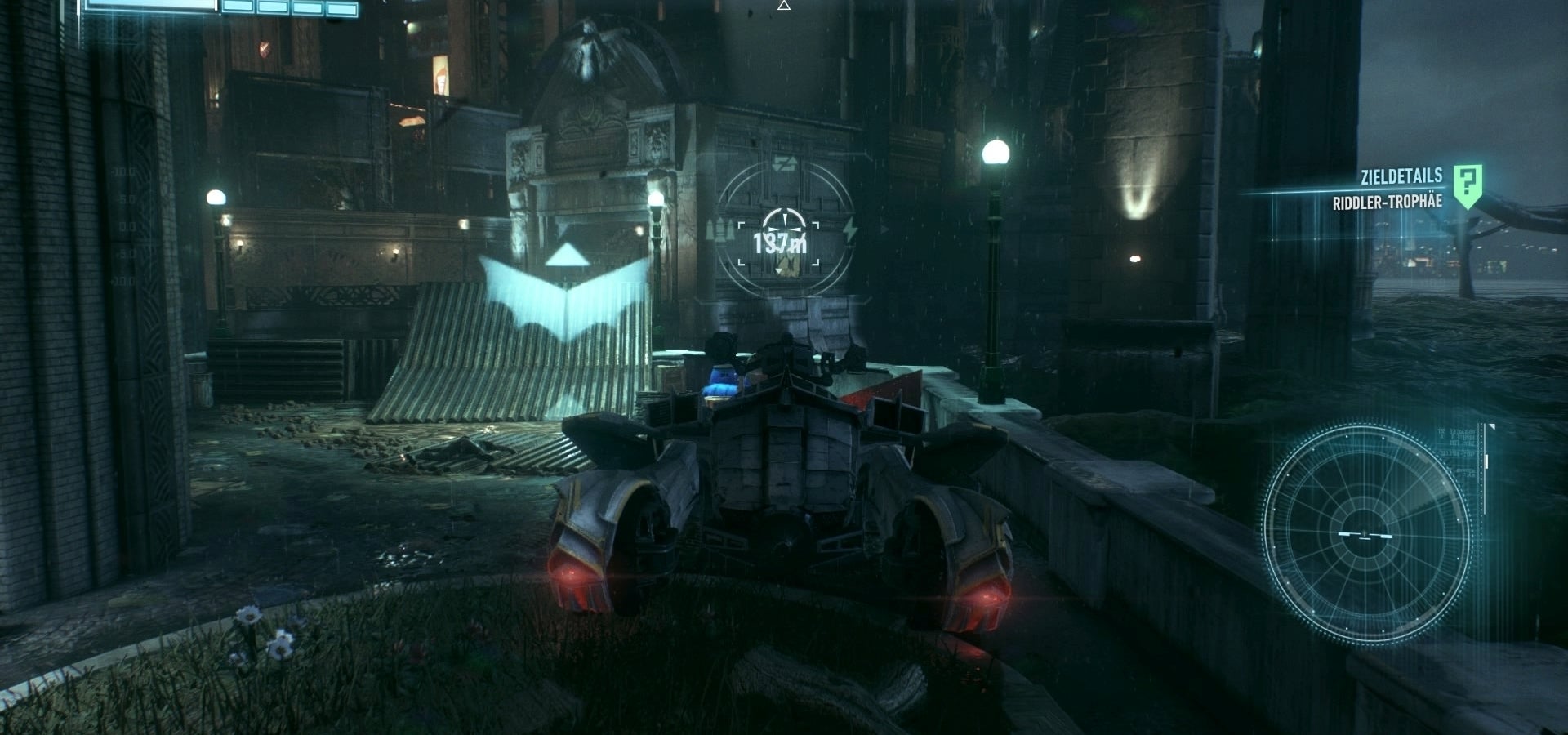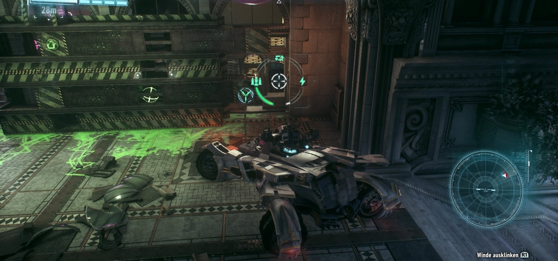22. Aan de zuidzijde van het gebouw vind je een ankerpunt voor de Winch van je Batmobile. Trek daaraan om een geheime doorgang te openen.