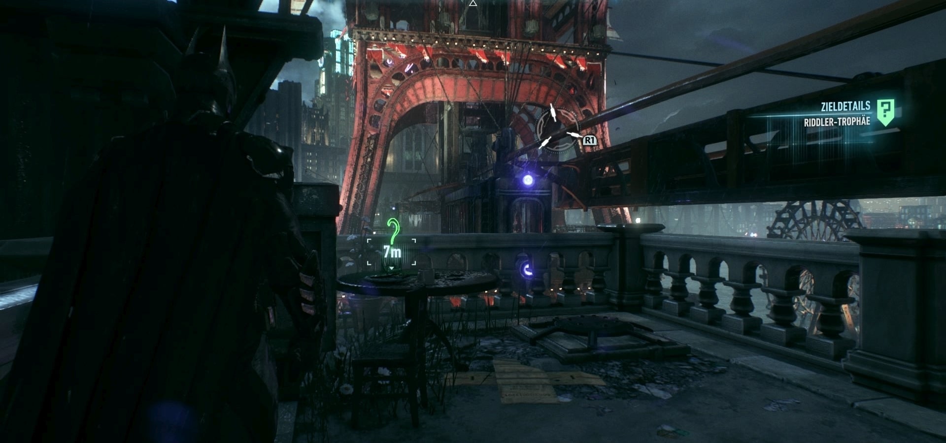 I. Scan van hieruit de onbereikbare Arkham City's Wonder Tower in het zuidoosten.