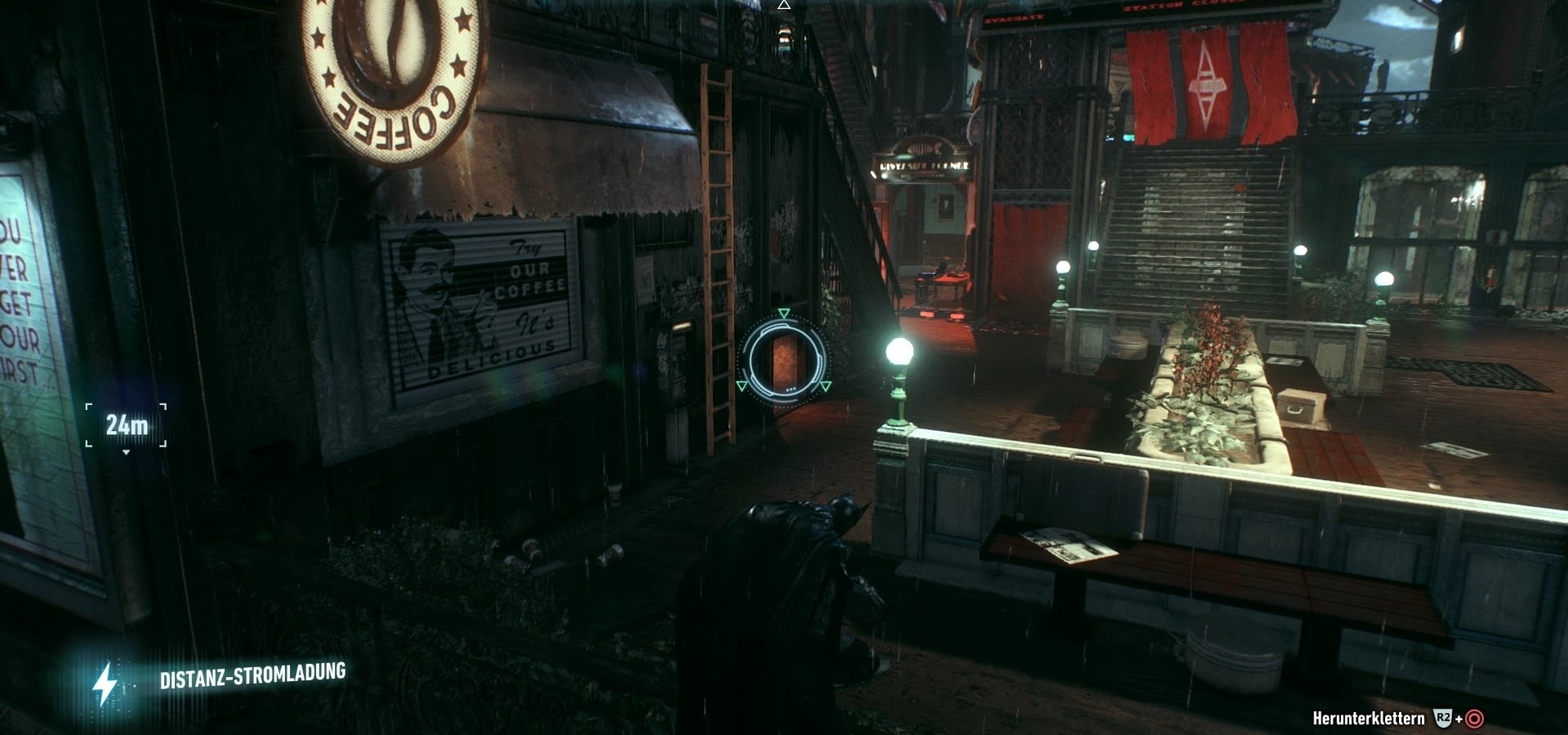 38. Aan de noordkant van Wayne Tower vind je aan de zijkant (screenshot) een ingang. Ga de trappen af om een trophy te vinden.
