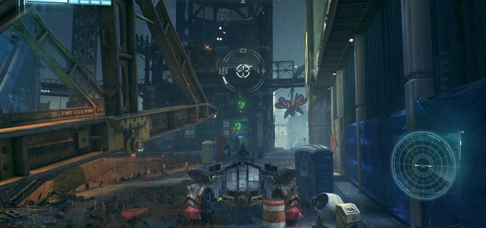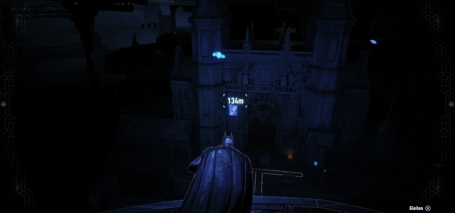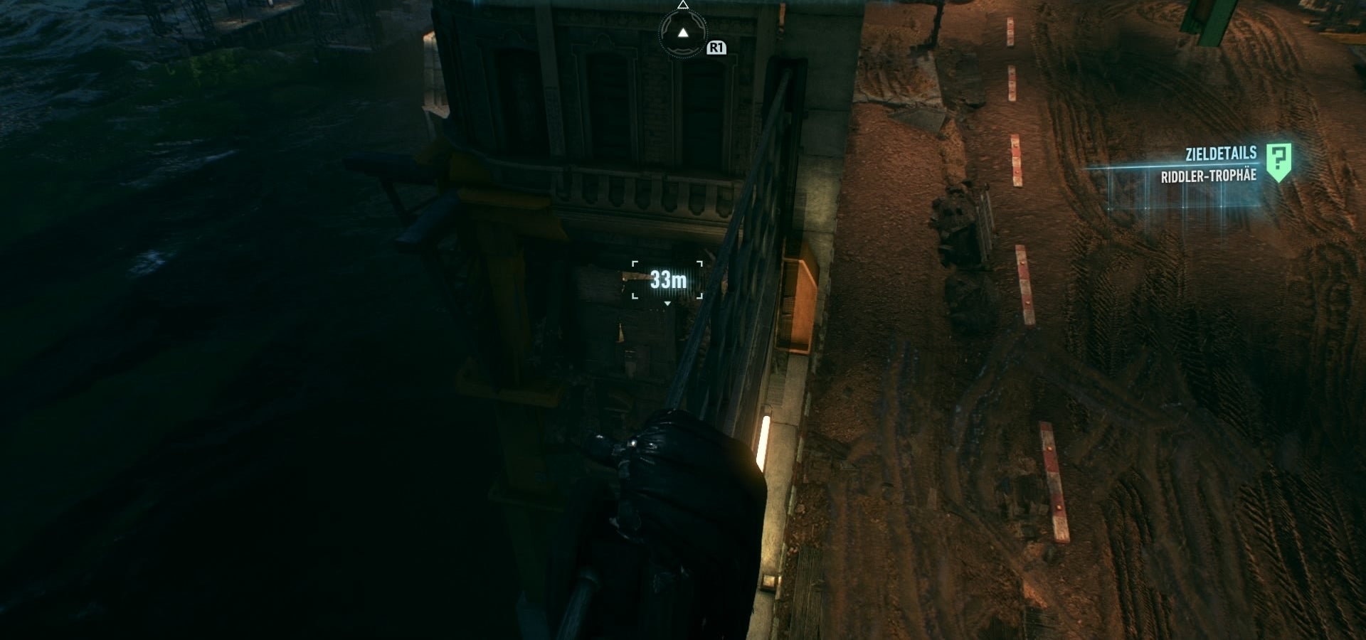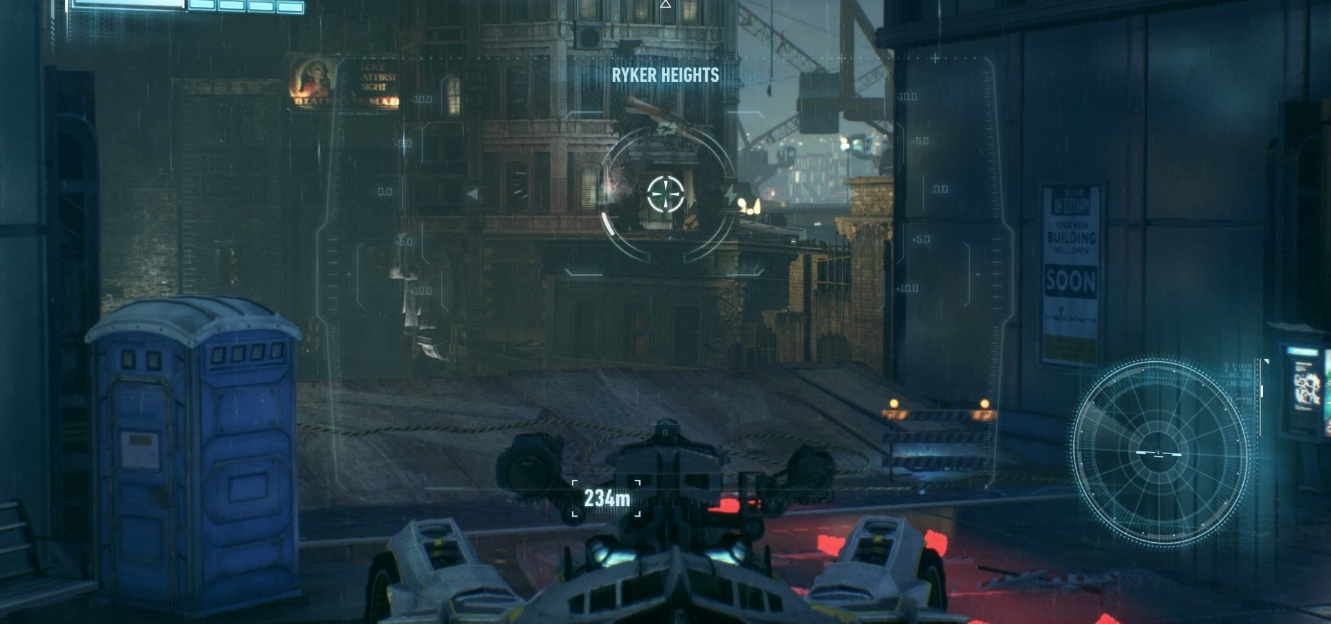 10. Activeer in de ruimte onder het gebouw de sonar van de Batmobile. Gebruik de Battlemode en gebruik je Sonar. Volg de oplichtende vraagtekens tot de ventilator in het plafond. Stap uit, richt op de ventilator en gebruik R1/RB om je tot op het straatniveau te hijsen (screenshot).Nu moet je snel de Batmobile oproepen en de sonar terug activeren. De vraagtekens verdwijnen namelijk als je er te lang over doet. Je doel is een blauwwit plakkaat aan de Bruford Tower.