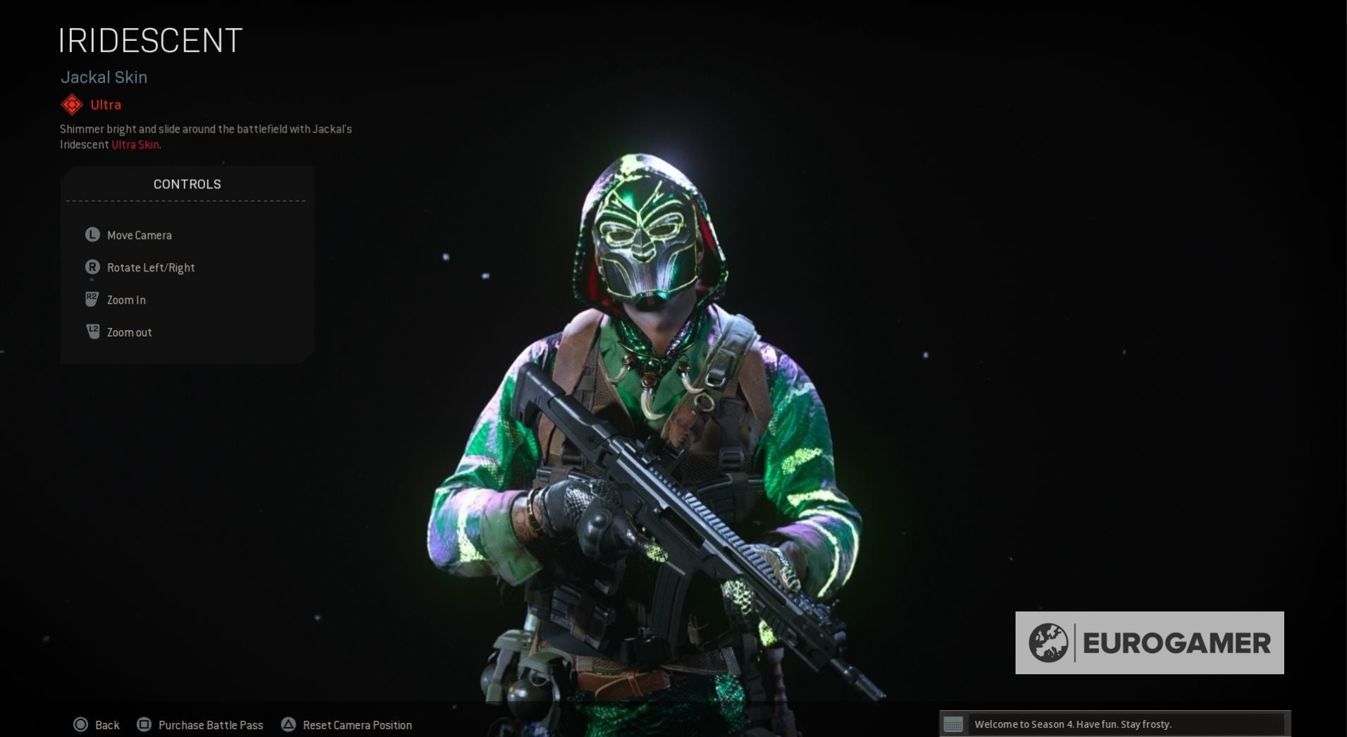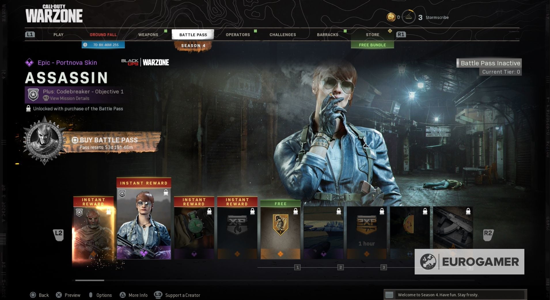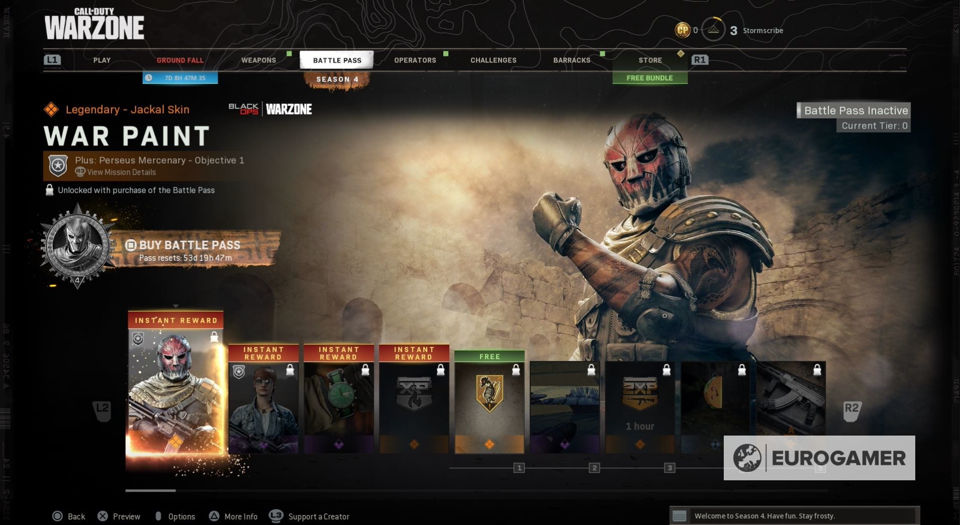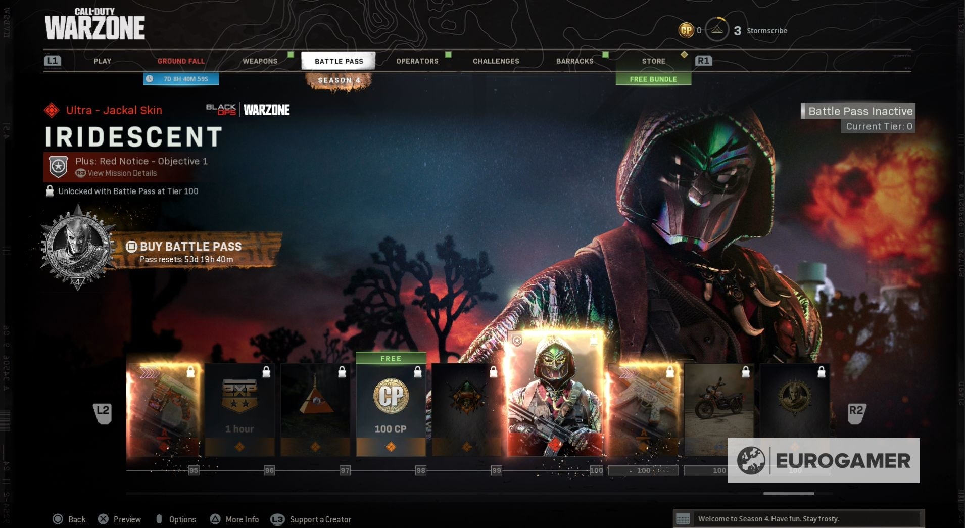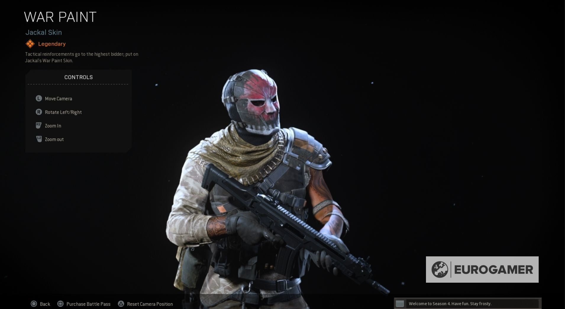 Seizoen 4 begint met een nieuwe skin voor zowel Jackal als Portnova - War Paint en Assassin. Wanneer je de Battle Pass tiers beklimt, kun je ook nieuwe weapon blueprints vrijspelen, COD-punten en, op Tier 100, de Iridescent skin voor Jackal.