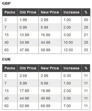 Voor wie in euro's betaalt, is er er algemene stijging van 11%. Voor een set van twee pakjes kaarten betaal je zo 2,99 euro in plaats van 2,69 euro voordien.