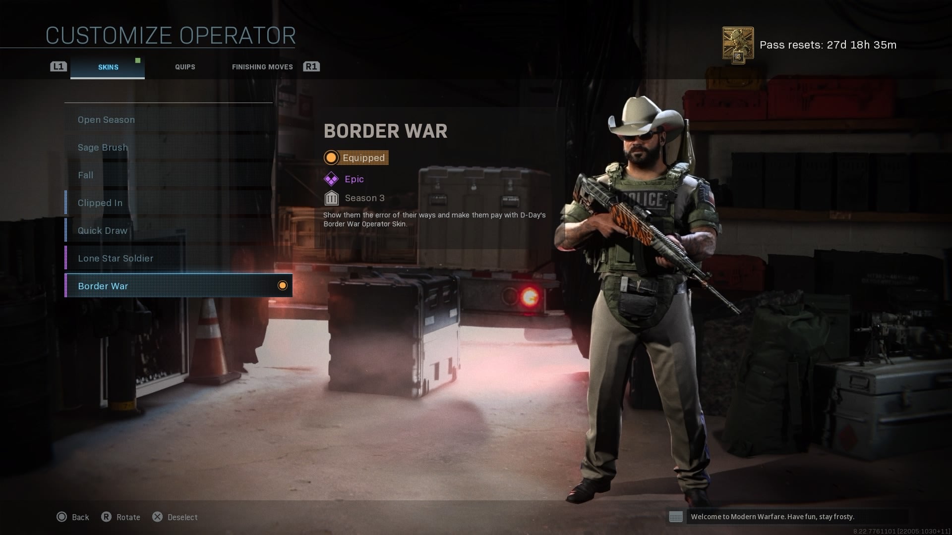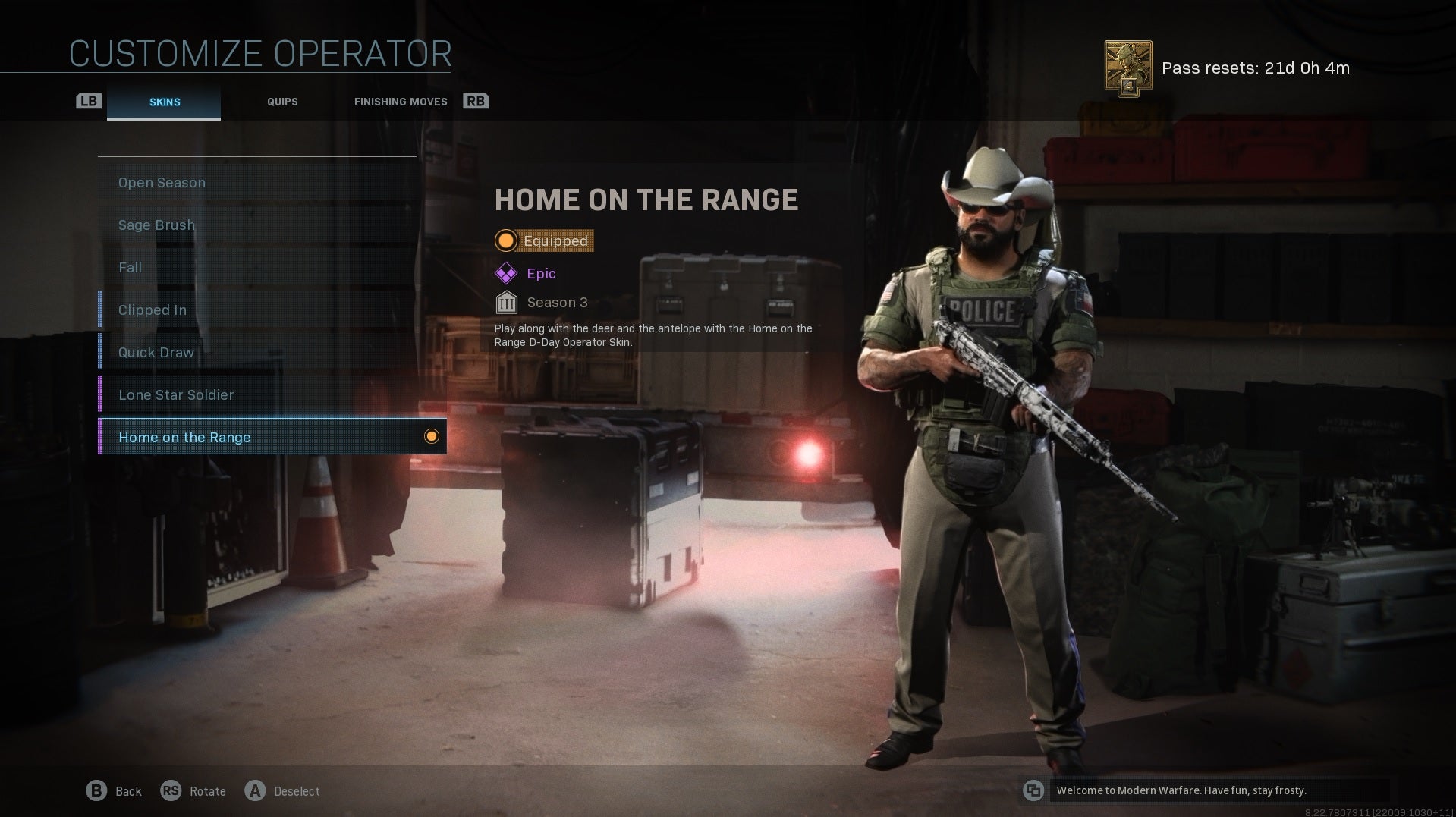 D-Day's Border War operator skin heet nu 'Home on the Range' en wordt als volgt omschreven: 'Speel samen met de herten en antilopen met de Home on the Range D-Day operator skin'.