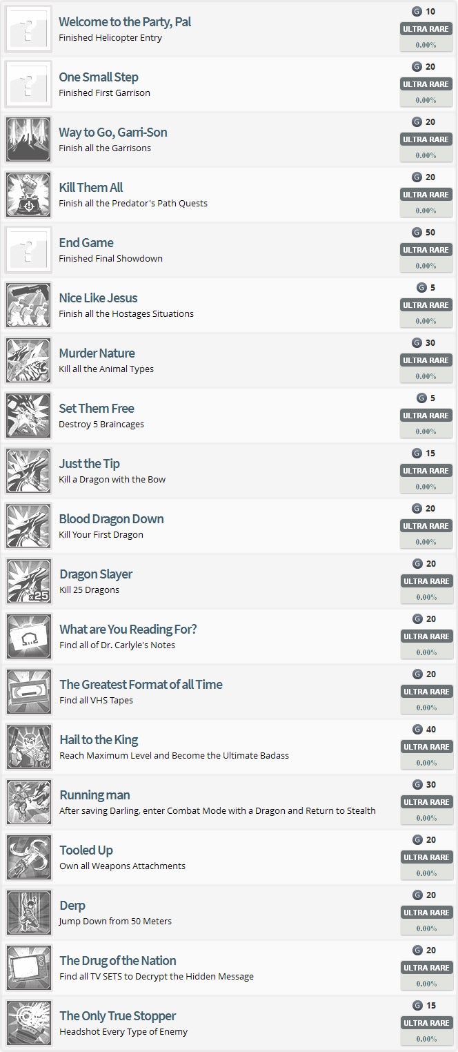 Allereerst doken de achievements op. Predator Path quests zullen ook in deze Blood Dragon te vinden zijn, maar in Far Cry 3 zat er volgens ondergetekende toch geen draak, laat staan 25 van die lieverdjes. Daarnaast zal je ook gijzelaars mogen redden, een boel collectables verzamelen, je wapens upgraden en een sprong van 50 meter hoogte overleven als je alle trofeeën wenst te ontgrendelen. Aanwijzingen over het type spel dat Blood Dragon zal worden, zijn er echter niet.