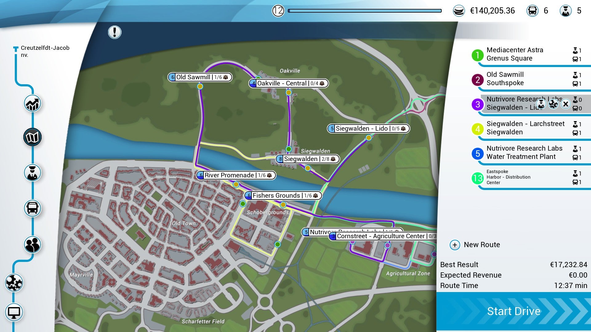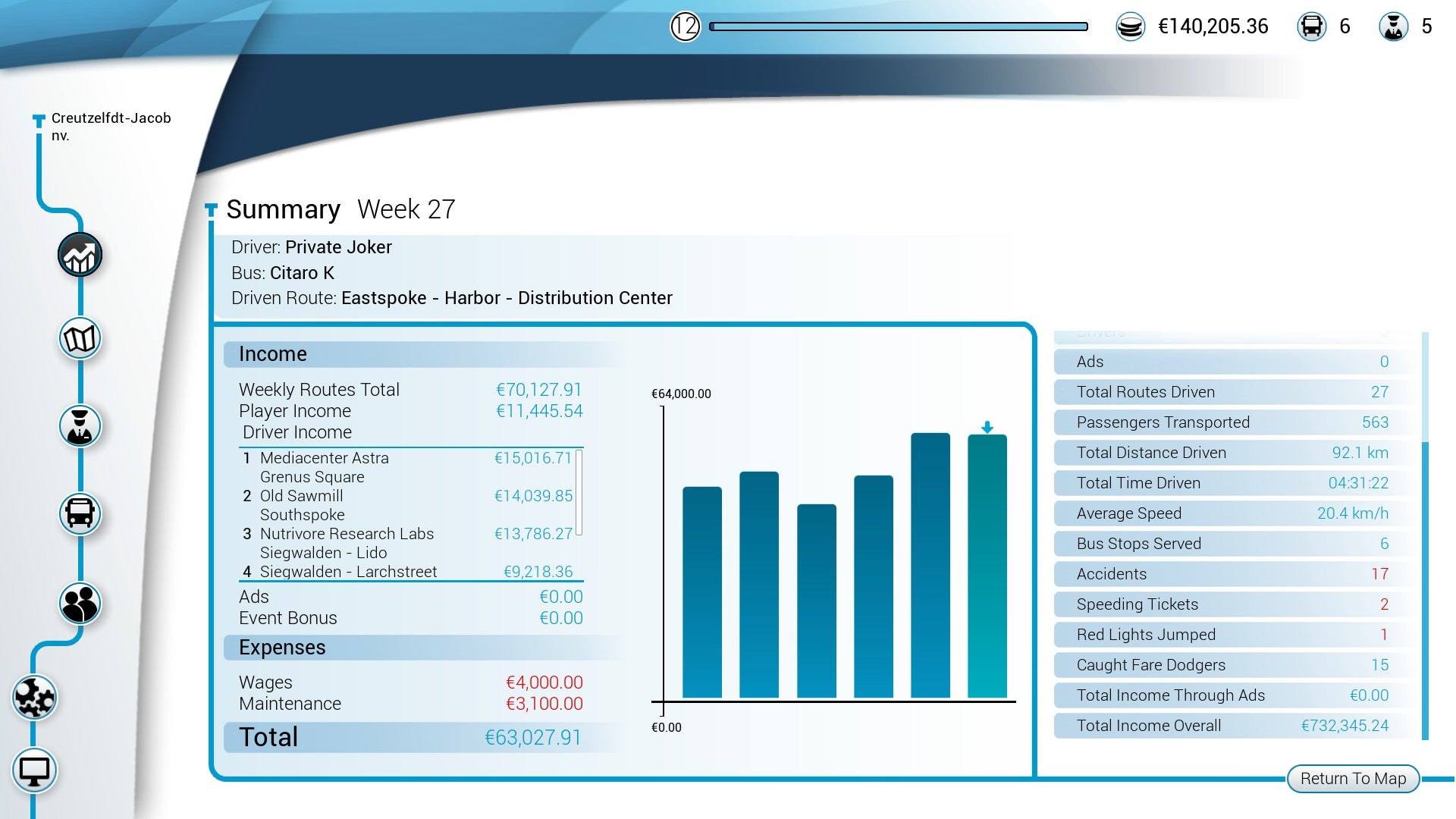 De drang om je busbedrijf uit te bouwen redt de game echter van de monotonie. Gaandeweg koop je een paar bussen bij en neem je werknemers in dienst. Je wijst hen aan routes toe en rijdt zelf een route naar keuze om een week te laten voorbijgaan. Bus Simulator blinkt echter niet uit in duidelijkheid. Medewerkers kunnen pas een omzet halen wanneer je een nieuwe route getest hebt om een referentie te bepalen, maar dat legt de game je niet uit. Sommige doelstellingen zijn evenmin helder, waardoor je vaak tevergeefs acties uitprobeert. Zo moet 85 procent van je haltes rendabel zijn, maar die percentages staan nergens vermeld. Dat zorgt even voor frustratie, maar aangezien de moeilijkheidsgraad van Bus Simulator niet hoog ligt, zie je dat door de vingers.