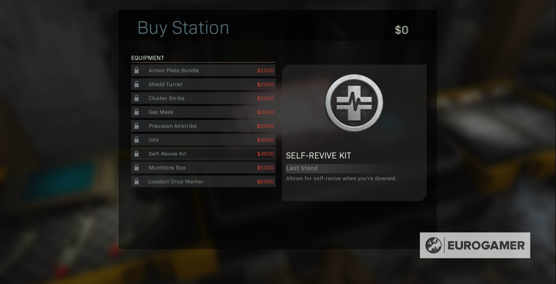 Een Self-Revive Kit kost $4500 en is bij iedere Buy Station op de map te koop.