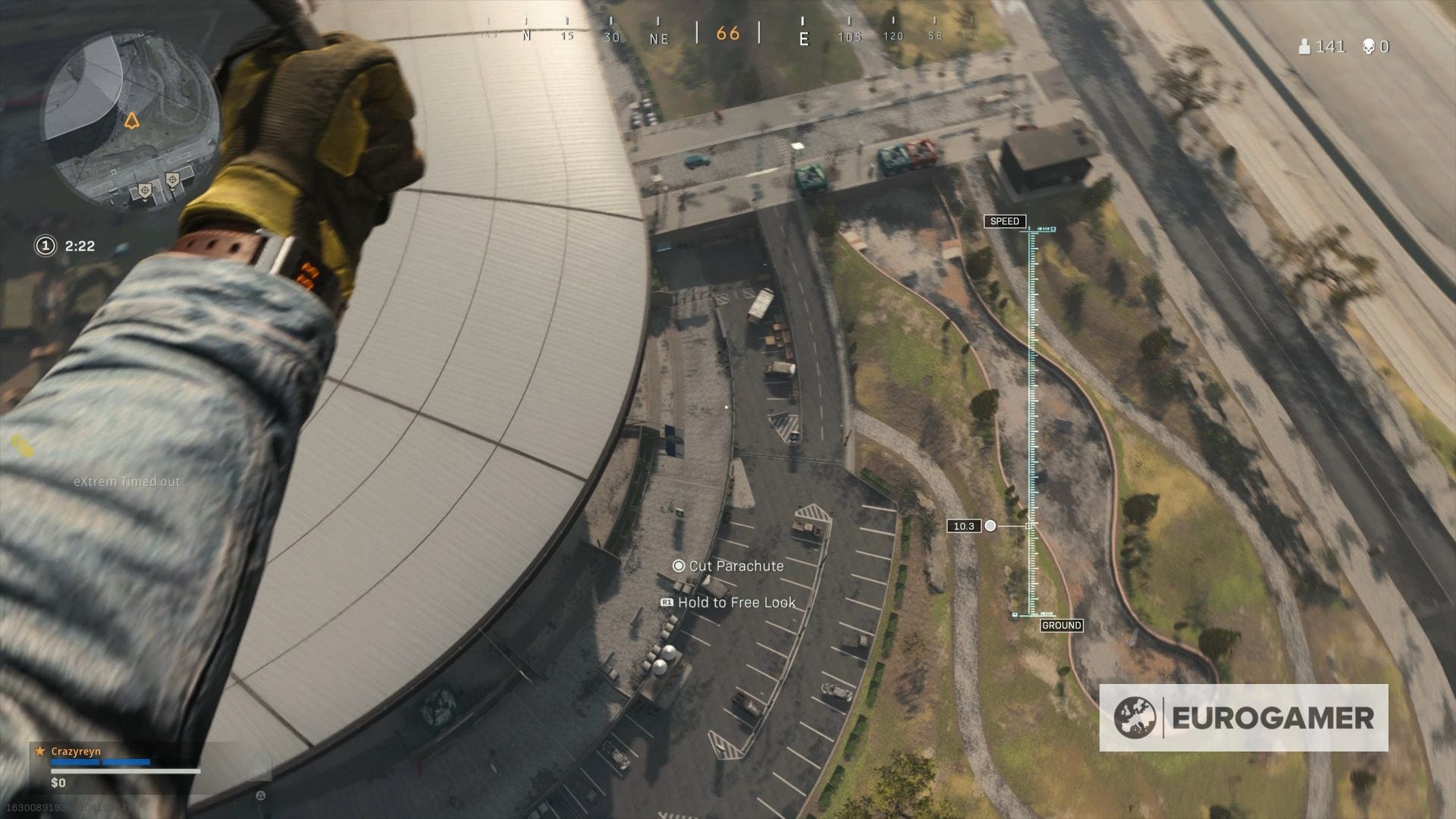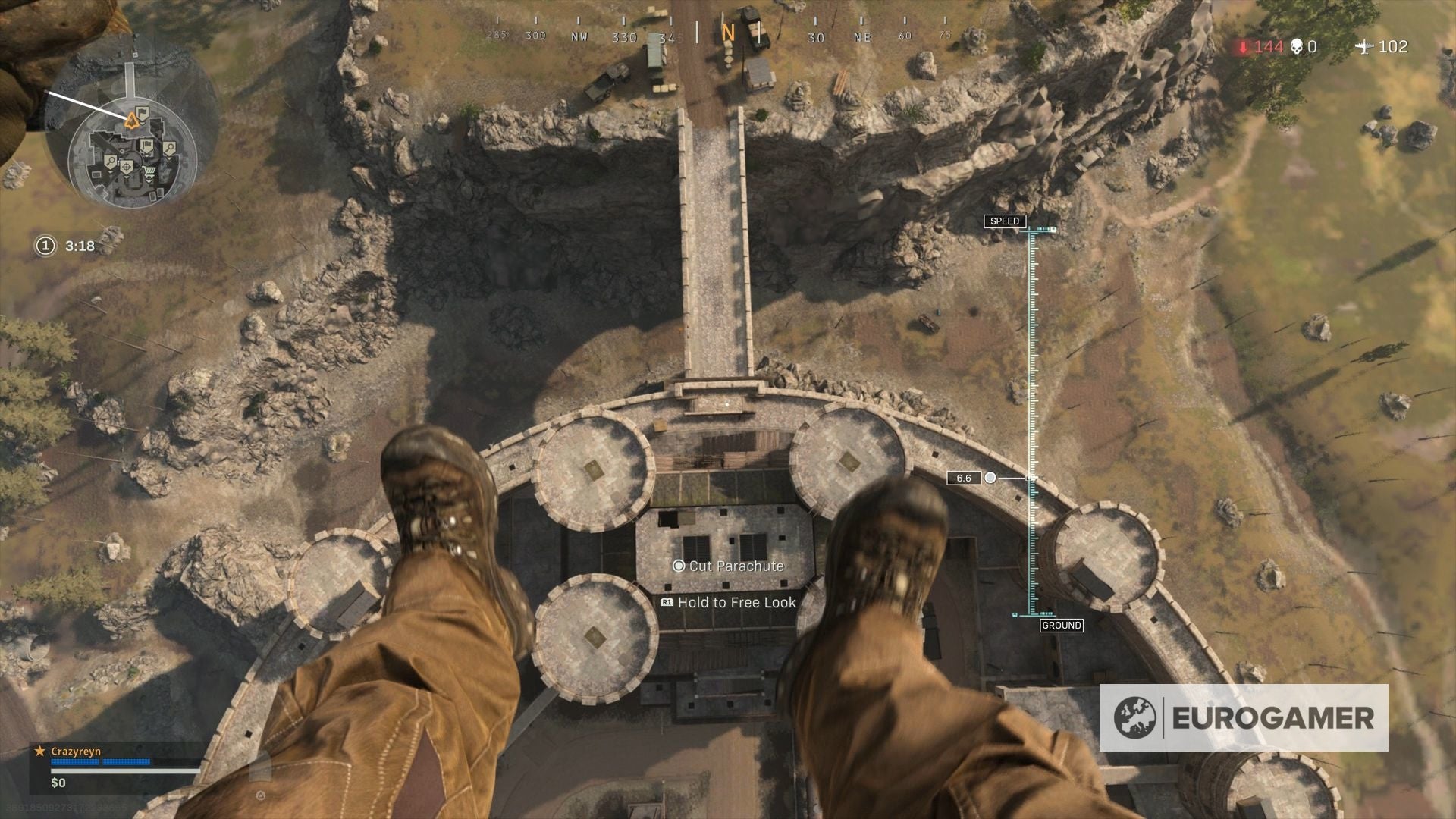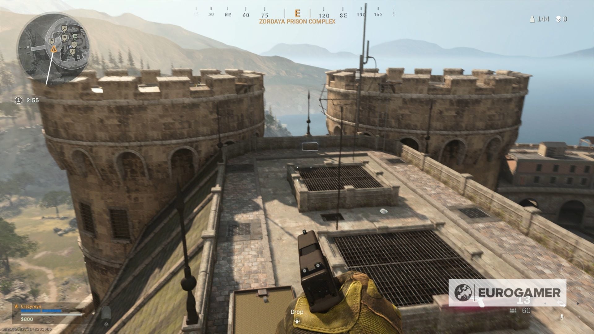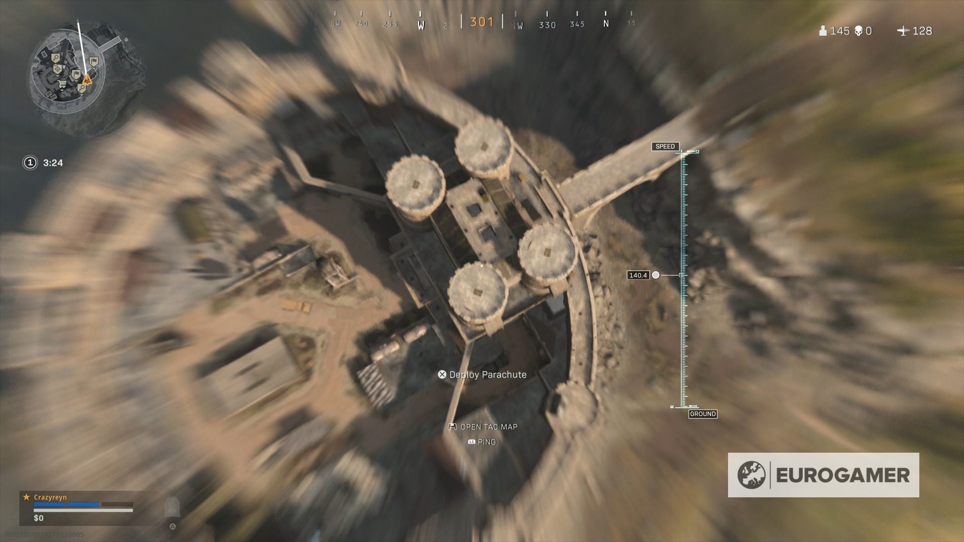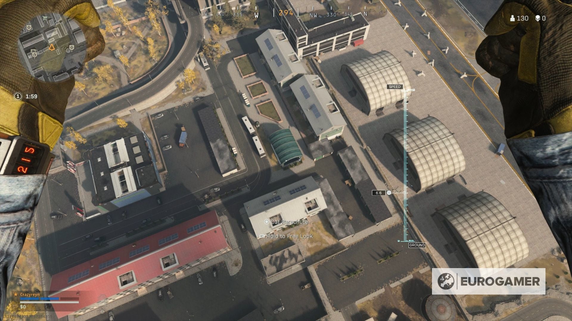 Je dient te landen bovenin het Prison-gebied, meer bepaald waar er vier torens in het noorden zijn.