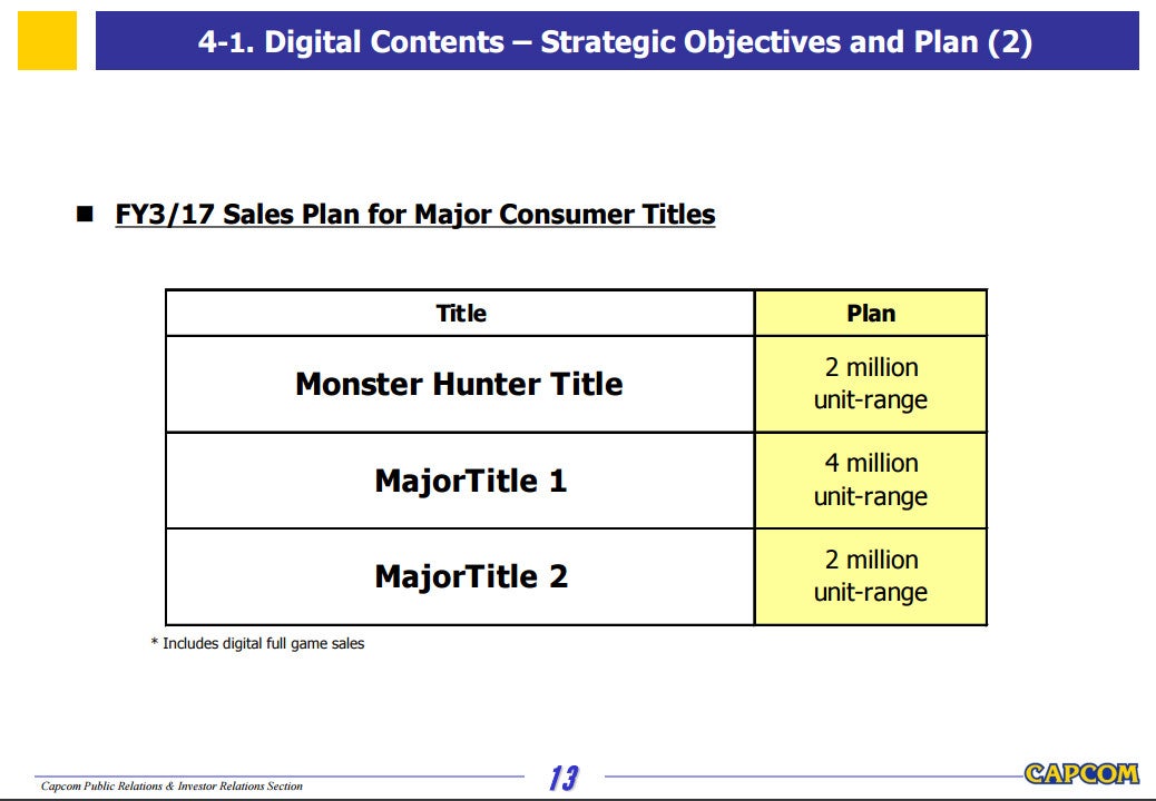 Een van de drie games die de studio wil uitbrengen is een nieuwe Monster Hunter-game. Deze titel moet volgens Capcom zo'n twee miljoen keer verkopen.