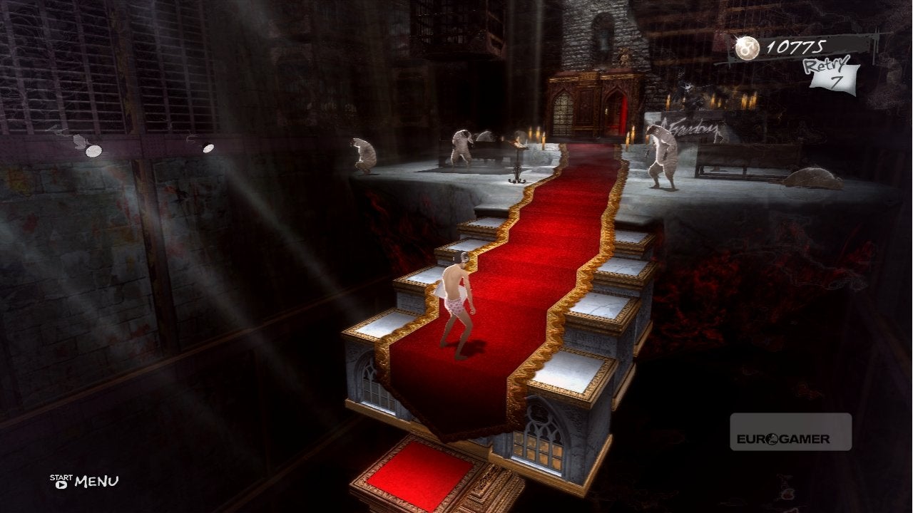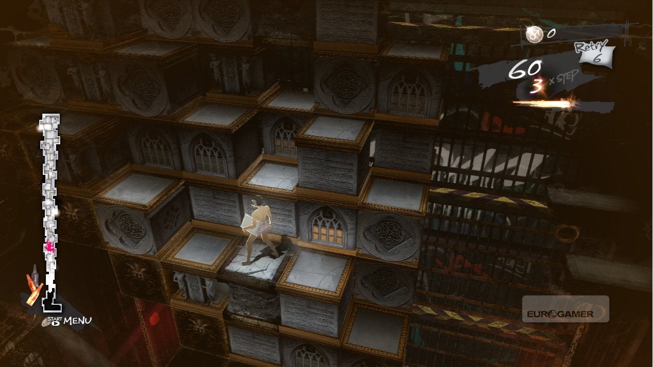 Catherine werkt namelijk met een ouderwets levenssysteem, waarbij levens aangevuld kunnen worden door de kussens die in de levels liggen te verzamelen. Zijn ze echter op dan word je naar het menu gegooid en moeten en duurt het meestal weer even voor je aan het spelen bent door de laadtijden en de cutscenes (die overigens allemaal overgeslagen of gepauzeerd kunnen worden). Gelukkig is het mogelijk om tussen elk level te saven om het lijden te verzachten, maar desondanks voelt het als een onnodige toevoeging.