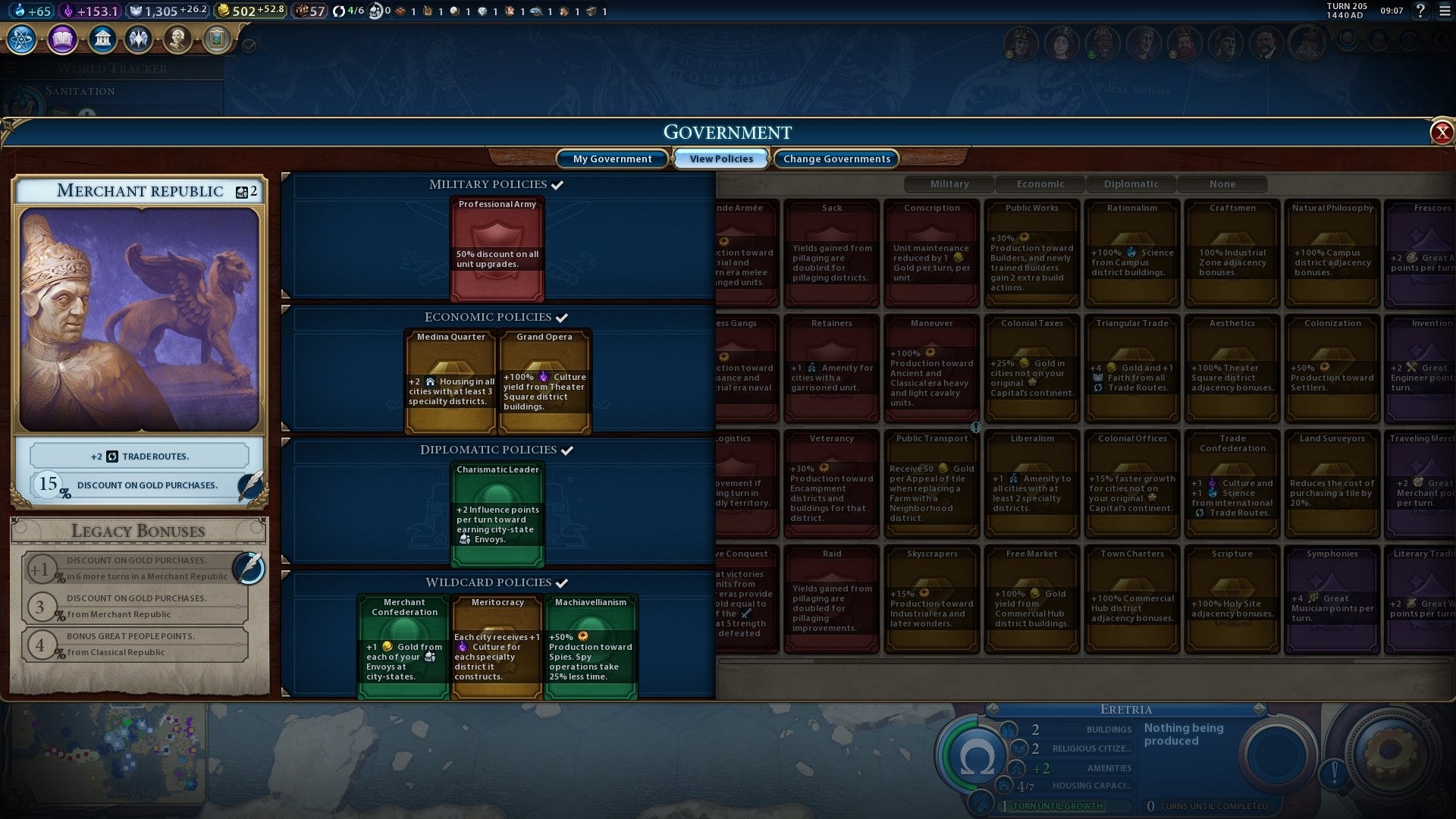 Die flexibiliteit wordt overigens nog versterkt door de Policies die de Civics opleveren. In Civilization 6 bouw je een eigen staatsapparaat op met verschillende 'kaarten'. Een democratie focust bijvoorbeeld vooral op economisch en diplomatiek beleid, maar die combineer je even goed met de Martial Law van een totalitair regime. Die Policy-kaarten ruil je voortdurend voor elkaar in om op noden en de wereldlijke situatie in te spelen. Ook daar geeft Civilization 6 de teugels uit handen en vertrouwt het op de spelers hun creativiteit.