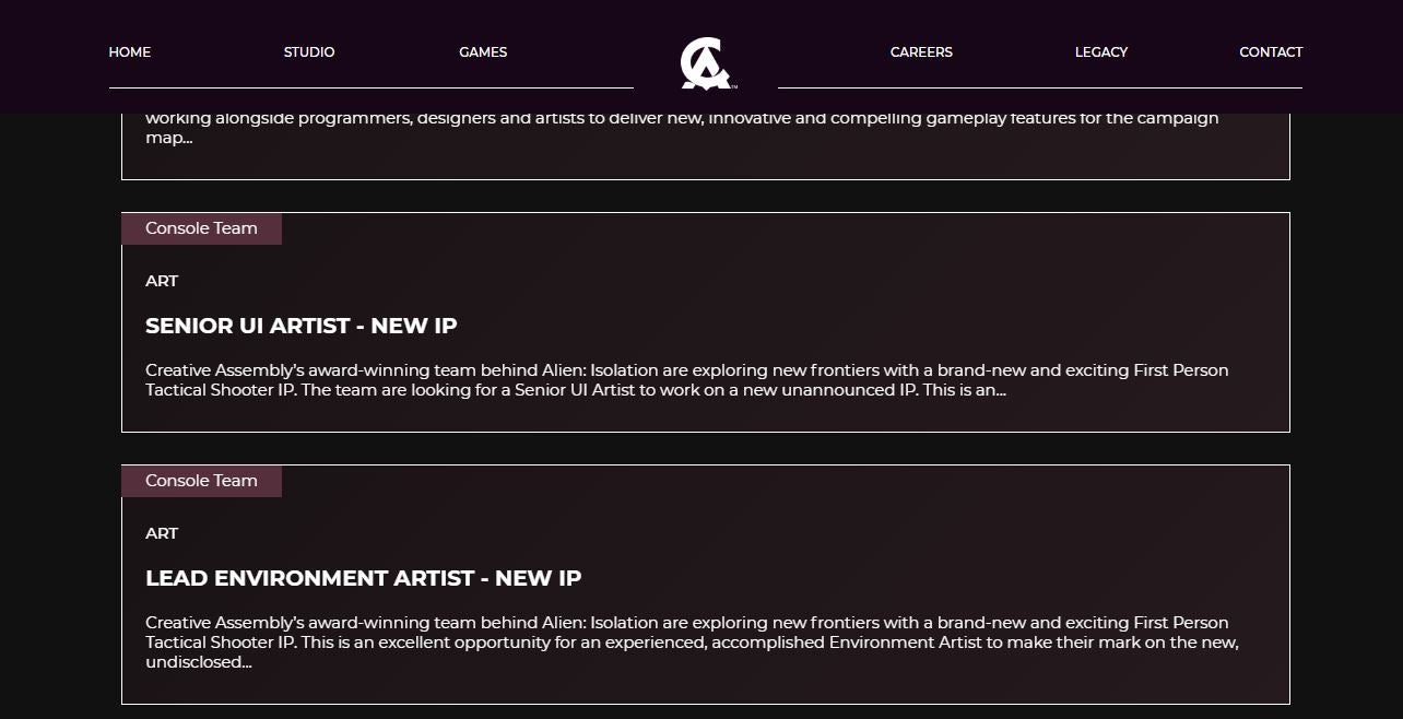Zo is het team verantwoordelijk voor Alien: Isolation op zoek naar nieuwe werknemers in verschillende functies. De gloednieuwe IP wordt omschreven als 'baanbrekend' en lijkt ook naar consoles te komen. De onbekende game is vermoedelijk nog in een vroege ontwikkelingsfase.