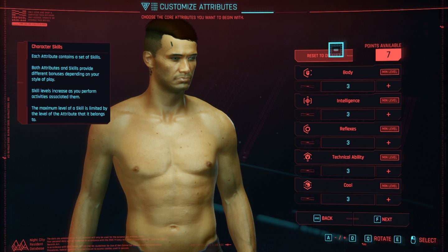 Voordat je aan de proloog begint, wordt er je vervolgens gevraagd om 7 punten te verdelen over de vijf skill types: Body, Intelligence, Reflexes, Technical Ability en Cool.