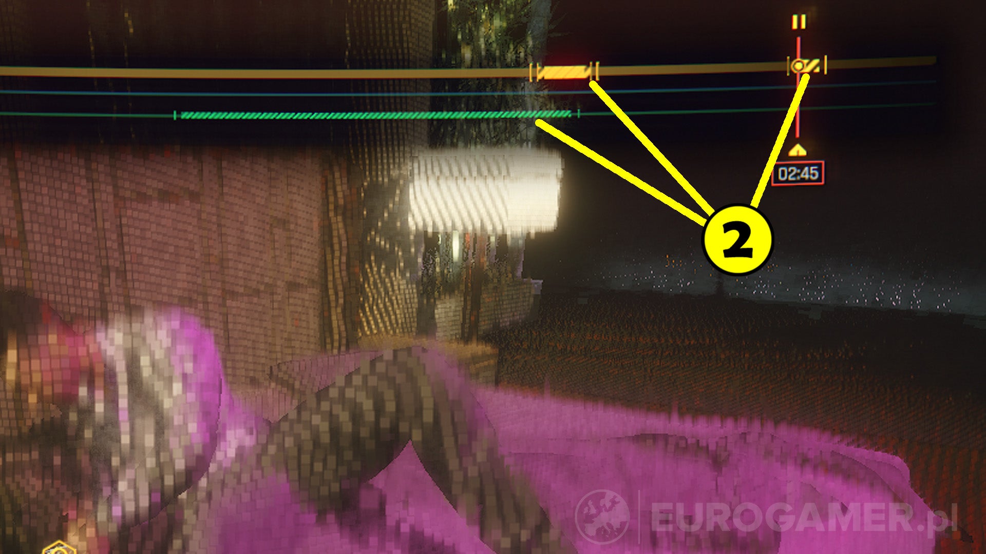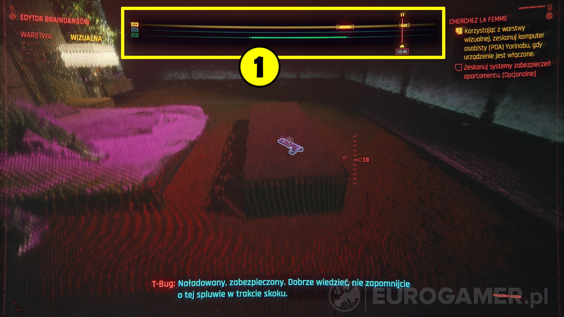 Je kan terugspoelen en doorspoelen in de Braindance met de Q en E-toetsen (QWERTY) of A en E-toetsen (AZERTY) op je toetsenbord, of met L2/LT en R2/RT op je controller tot je de aangeduidde fragmenten (2) bereikt in de layer balk. Ergens in deze aangeduidde fragmenten zitten de aanwijzingen verborgen die je moet scannen.