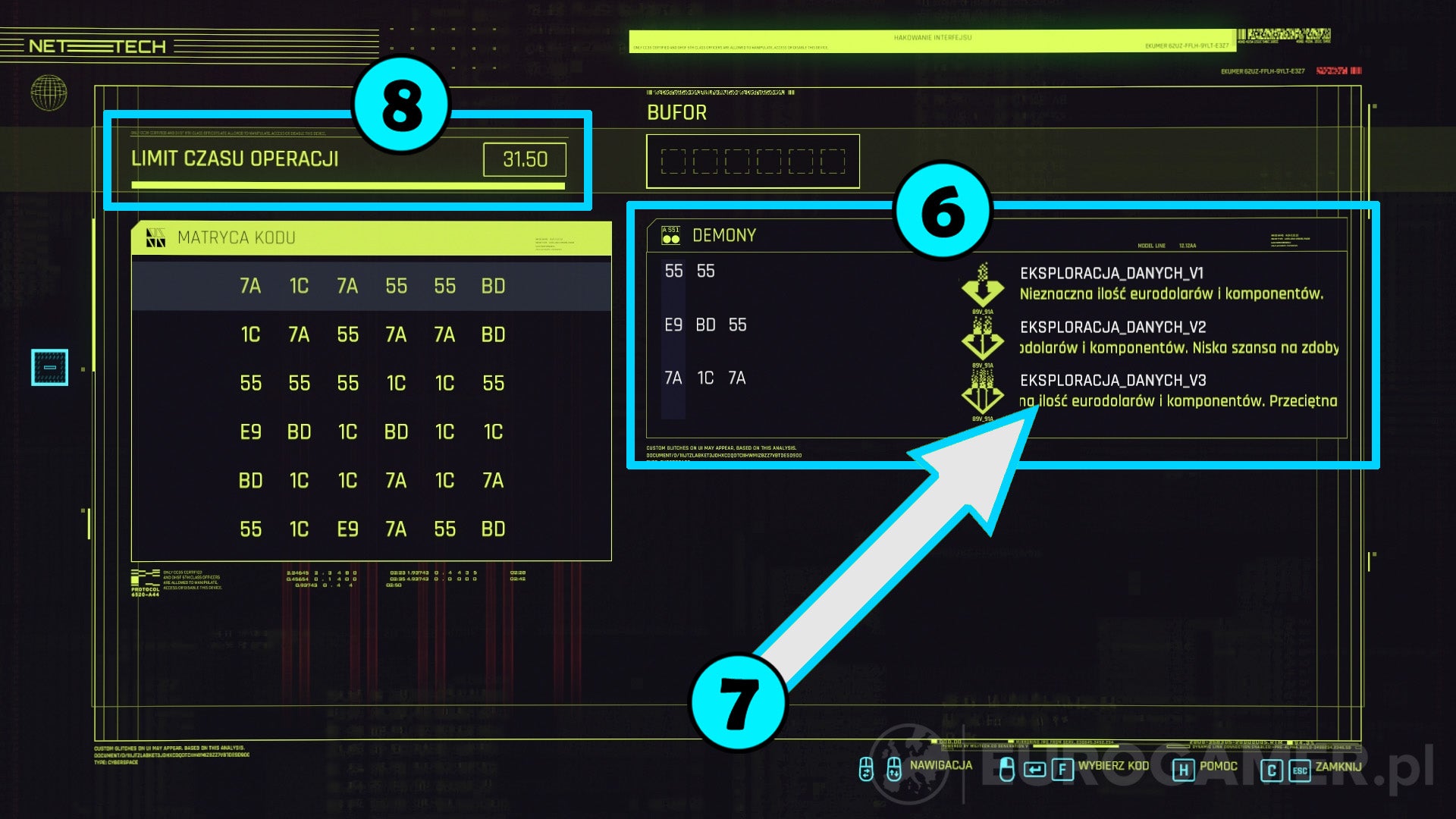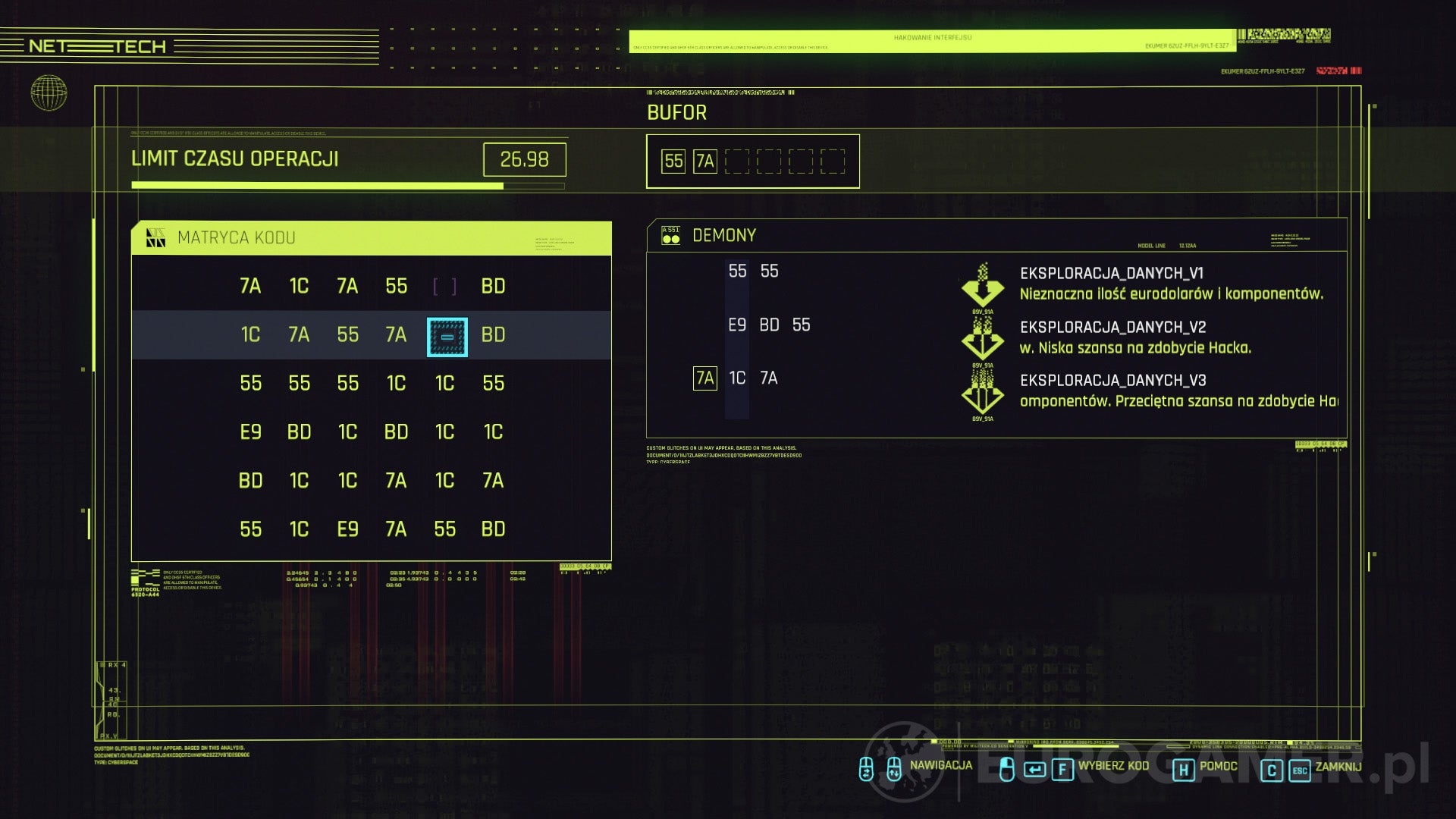 Het doel van de hacking mini-game: de combinatie van cijfers en letters die naast de Daemons staan, in de juiste volgorde invoeren in de buffer met de Code Matrix.