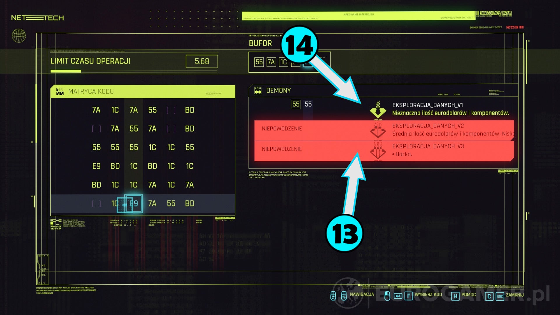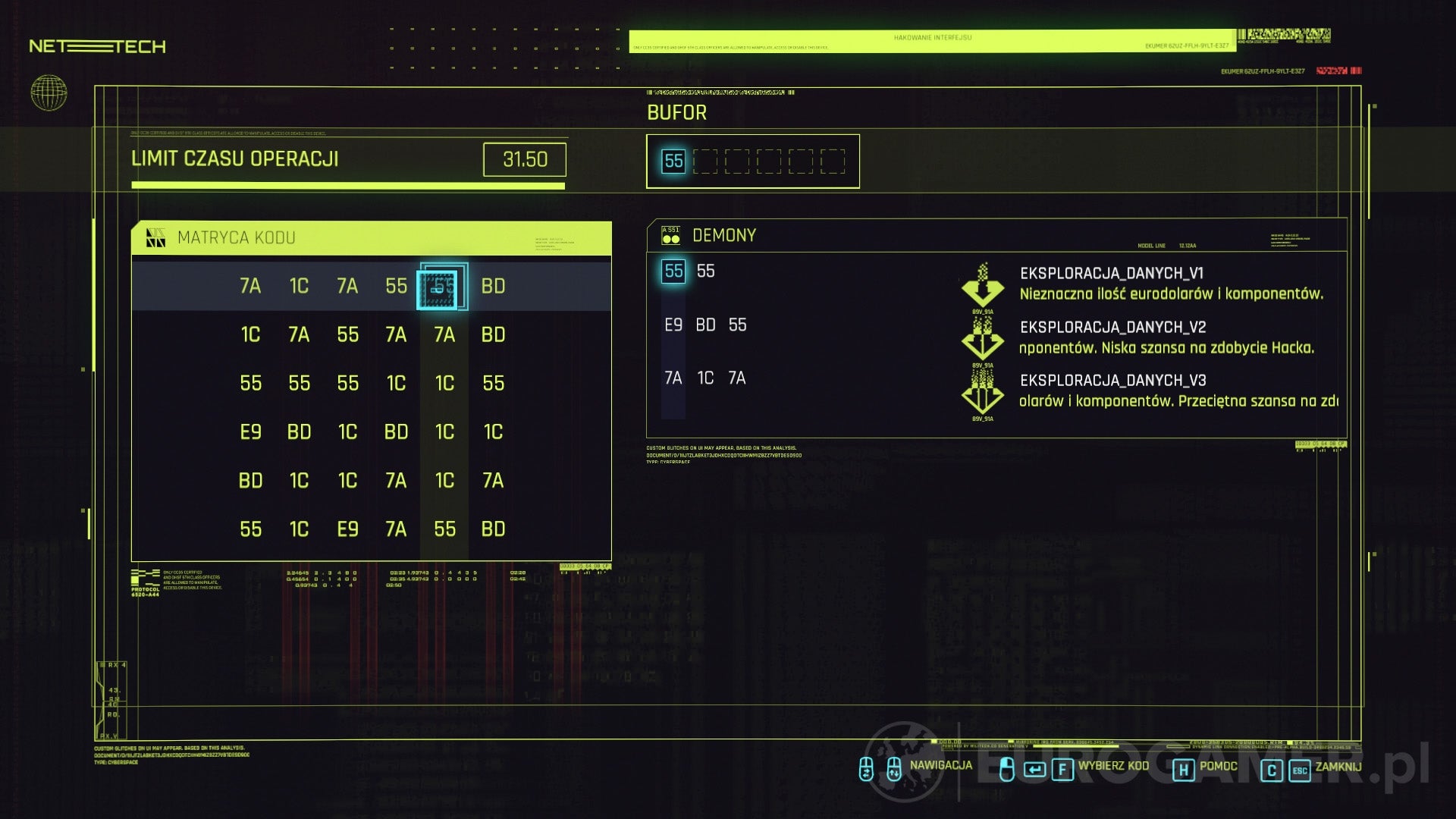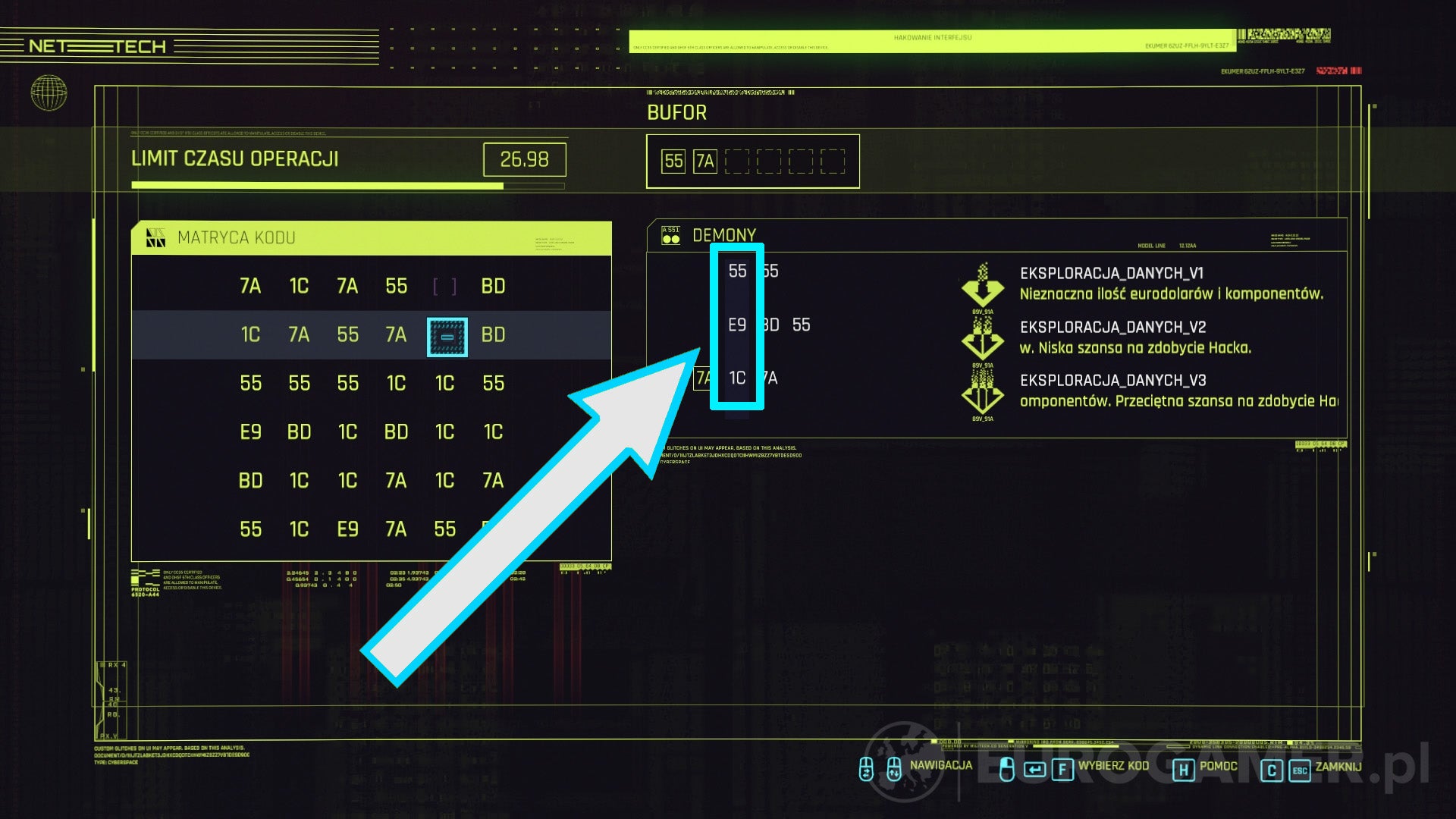 Belangrijk: om meerdere Deamons tegelijk te activeren hoef je de sequenties niet afzonderlijk in te voeren. Je kan de reeksen gewoon combineren en tegelijk in je buffer plaatsen. De minigame blijft doorgaan zolang je maar een 'bruikbare' combinatie kiest en in de buffer plaatst. In het volgende voorbeeld kunnen we kiezen welke combinatie we in de buffer steken. We kunnen kiezen uit 55, E9 en 1C: