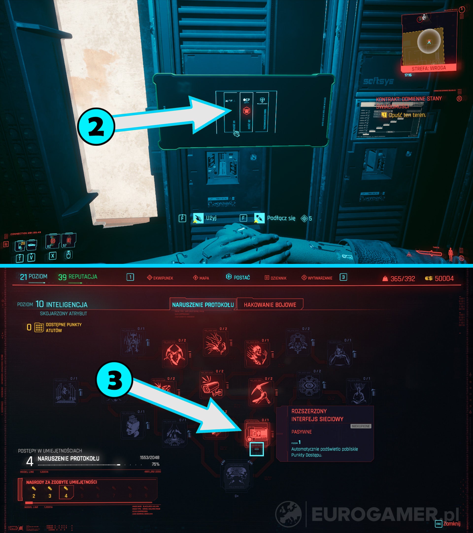 - Fysiek - door interactie met een Access Point (2). Deze zijn gemarkeerd met een speciaal icoon. Je kan deze Access Points gemakkelijk vinden met de perk Extended Network Interface (3) die je onder het tabblad 'Breach Protocol' vindt in de skill tree.