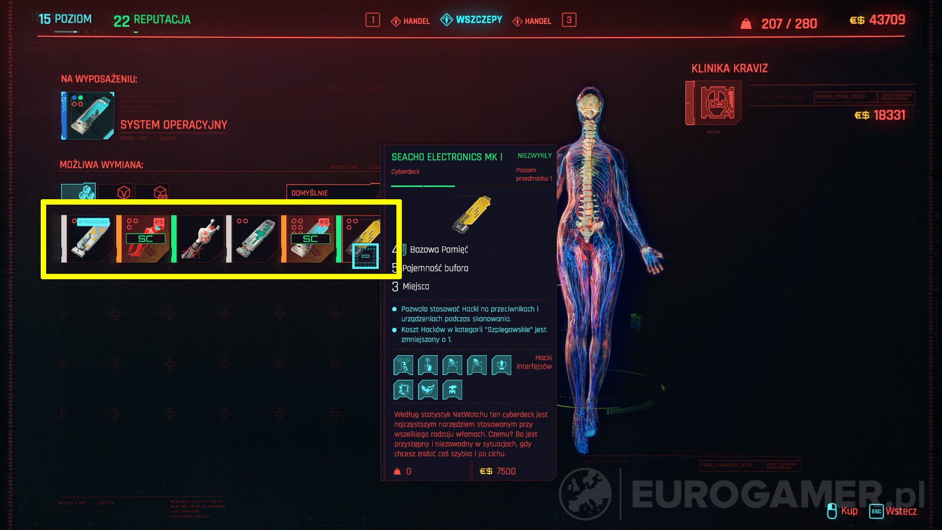 Hier kan je de Cyberdecks die je al in je inventory hebt bekijken, en ook nieuwe kopen. Kijk naar de basiseigenschappen die we hierboven opsomden en beslis welke het beste paste bij het personage dat je wil maken.