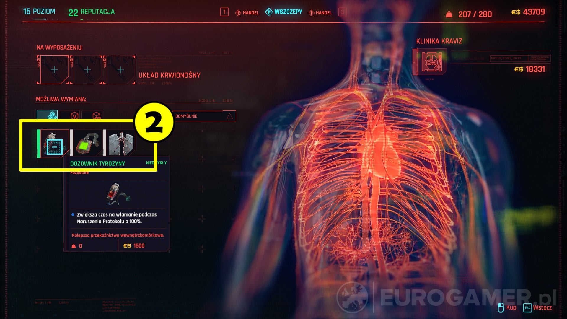 Selecter een categorie om de beschikbare Cyberware in je inventory en in de winkel (2) te bekijken. Je kan een Cyberware installeren zolang je voldoet aan de voorwaarden in de beschrijving en natuurlijk genoeg geld hebt.