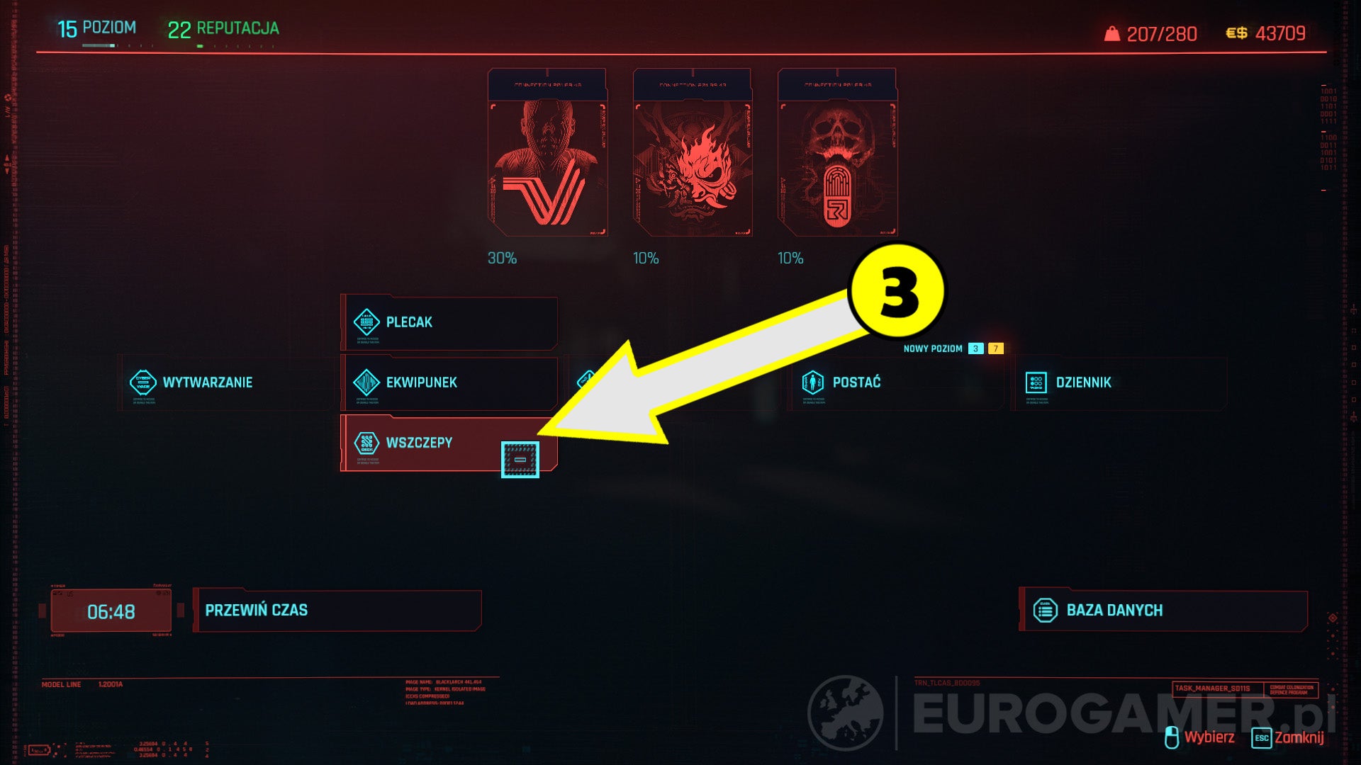 Om de beschikbare Cyberware Mods die je hebt te bekijken, selecteer je Cyberware (3) in je Character menu.
