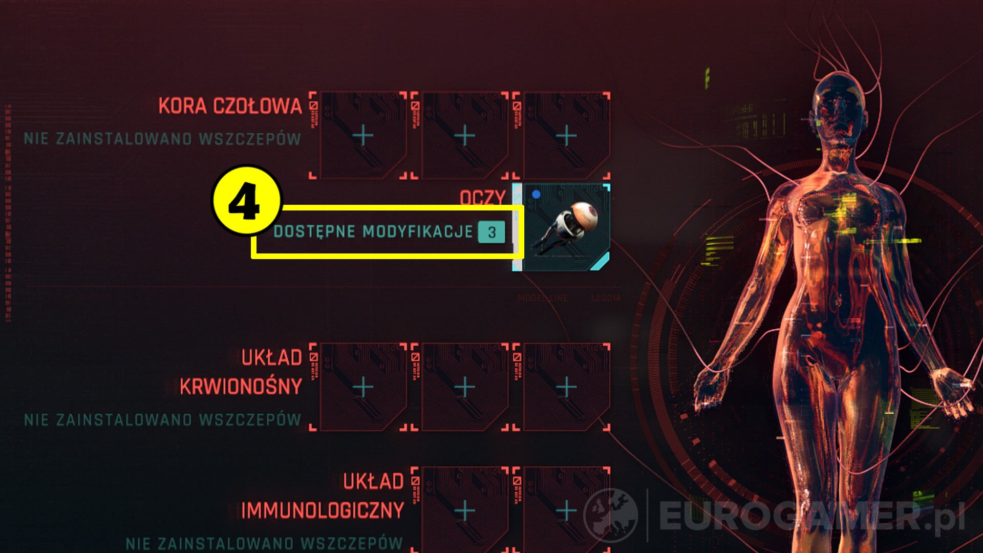 Als je Mods hebt die compatibel zijn met bepaalde Cyberware, dan wordt dit aangeduid met een icoontje (4) naast de relevante Cyberware.