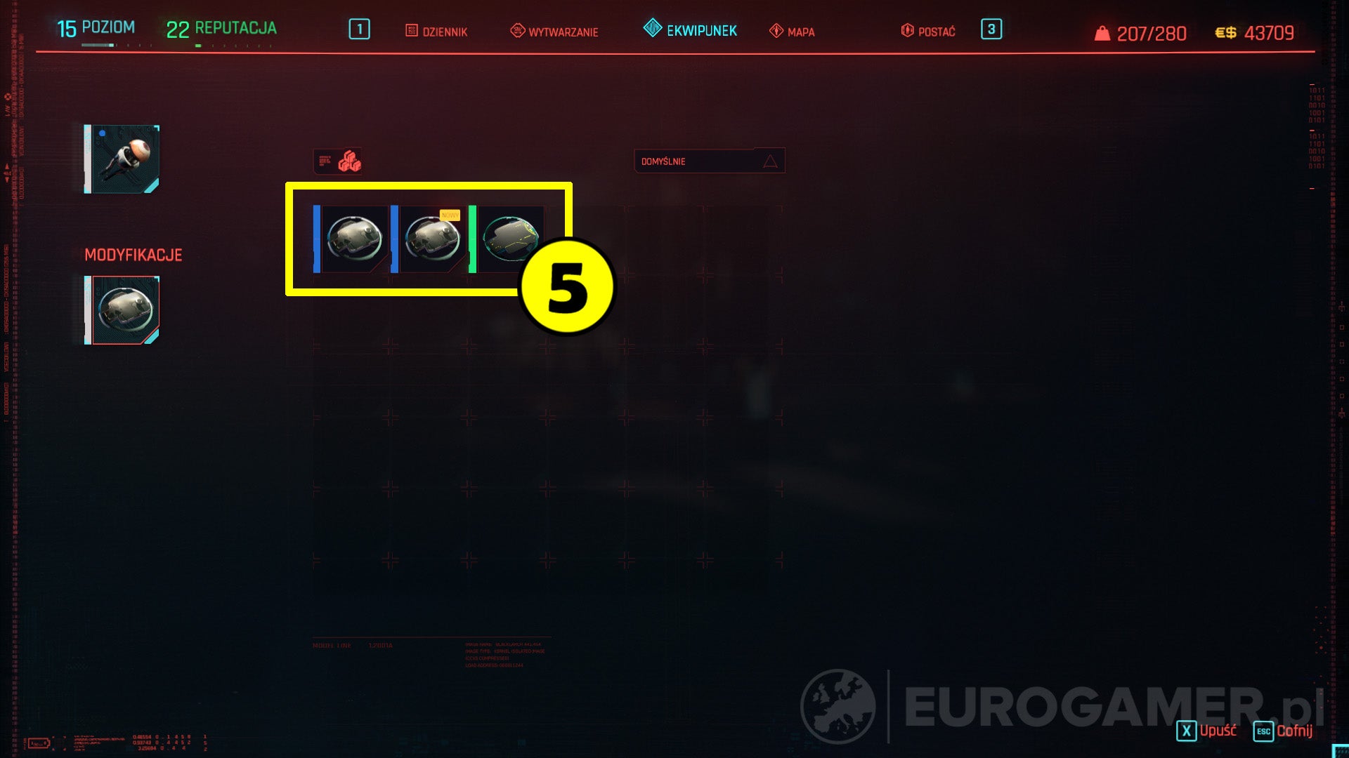 Selecteer de Cyberware, en je krijgt een lijst met mogelijke Cyberware mods in je inventory (5). Selecteer de mod die je wil toepassen, en deze wordt meteen actief.