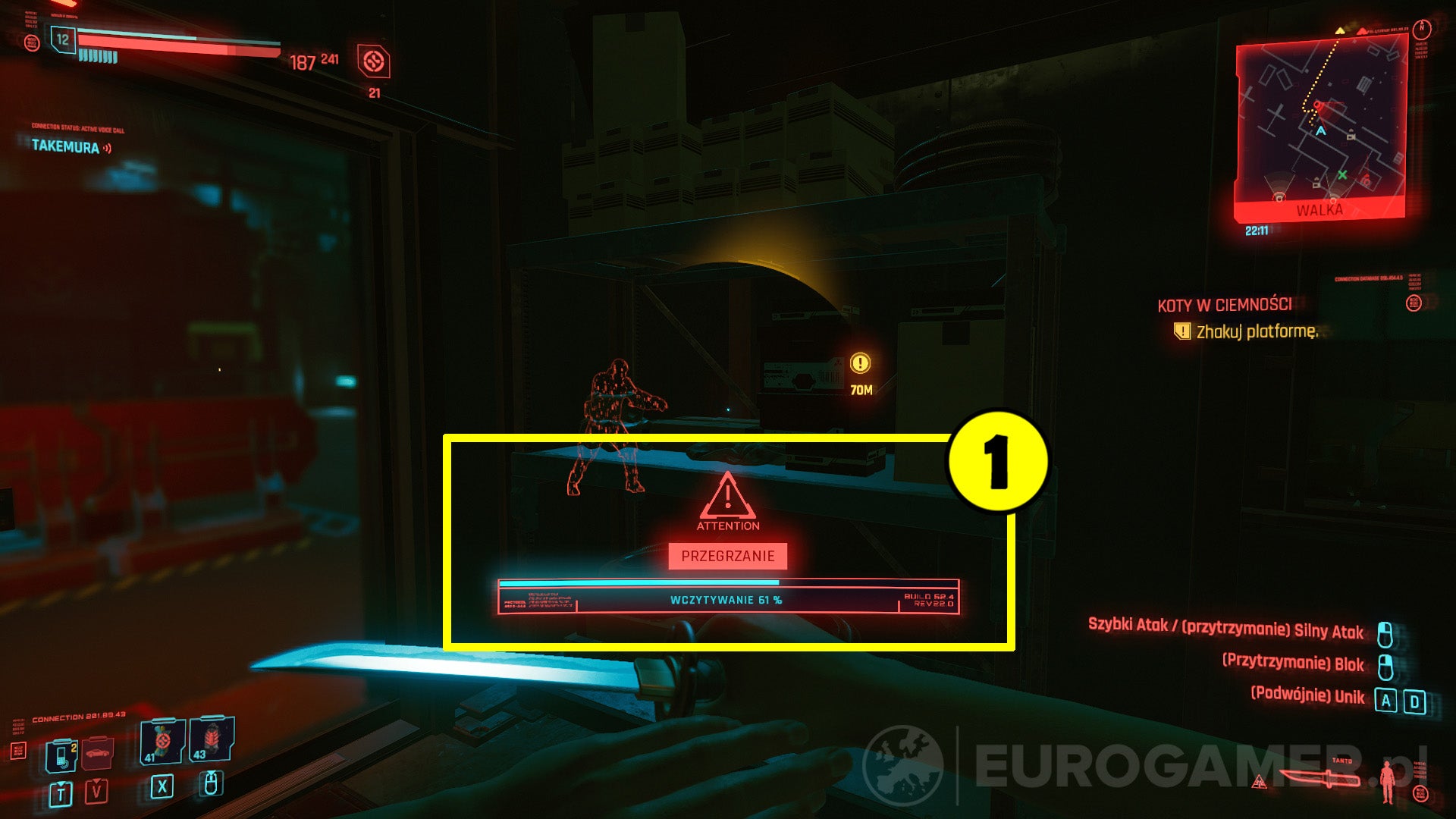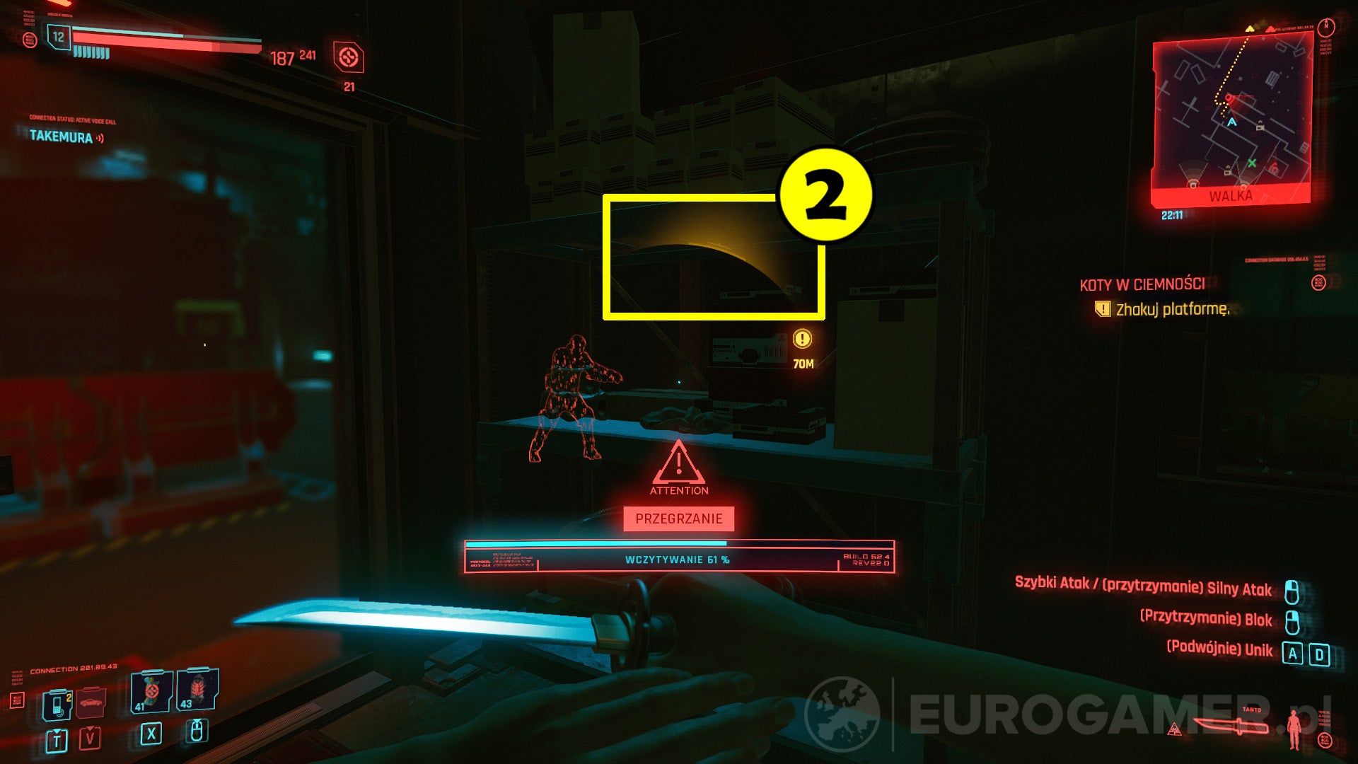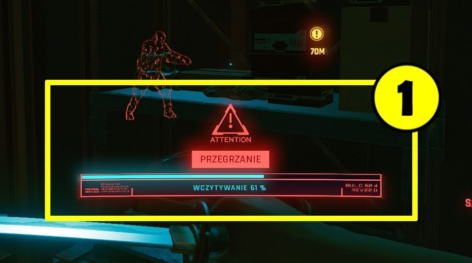 Om de vijandige netrunner te vinden die de Overheat veroorzaakt, moet je de oranje marker (2) volgen. Deze duidt de geschatte positie van de netrunner aan.