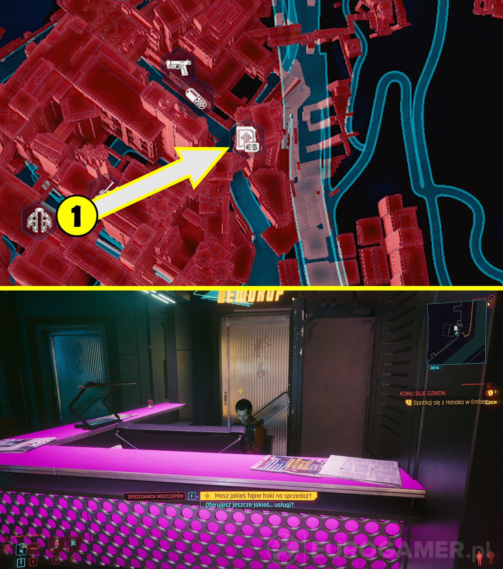 De eerste manier is om naar een Netrunner (1) te gaan en Quickhacks te kopen. Netrunners worden op je map aangeduid met een wit Hack icoontje. Er zijn verschillende Netrunners verspreid over Night City.