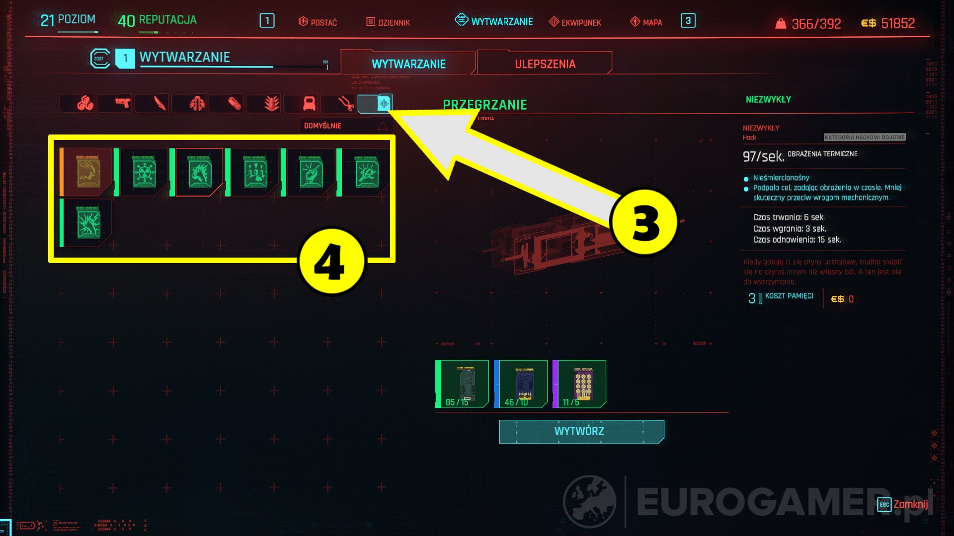 Je kan Quickhacks ook craften, net zoals andere items. Om een Hack te craften open je het crafting menu en ga je naar de QuickHacks pagina (3). Hier zie je alle Quickhacks waar je de Crafting Specs (4) voor hebt.