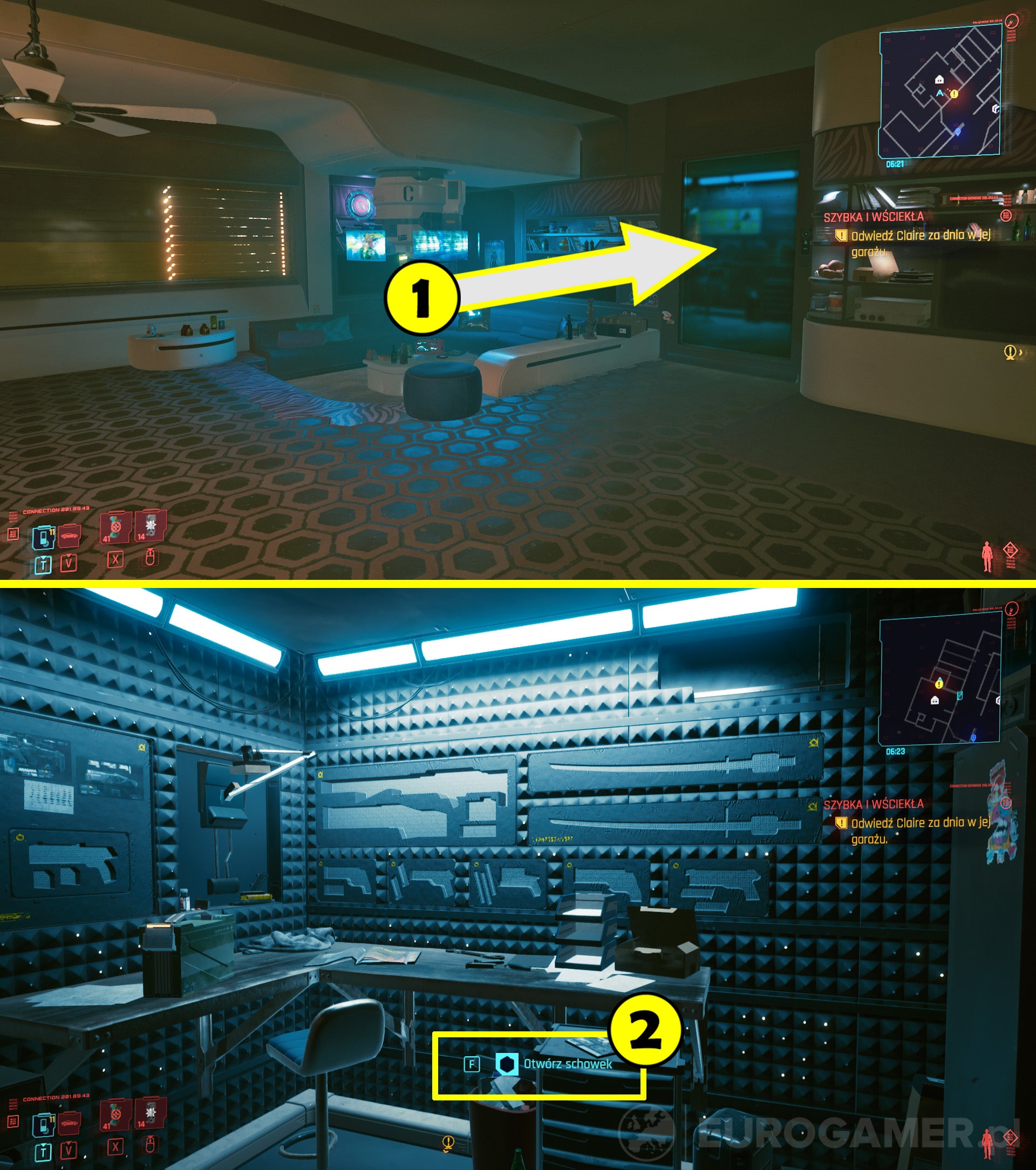 Om de stash te gebruiken, ga je naar het appartement van V en vervolgens naar de kamer rechts van de ingang (1). Dit is de armory (2).