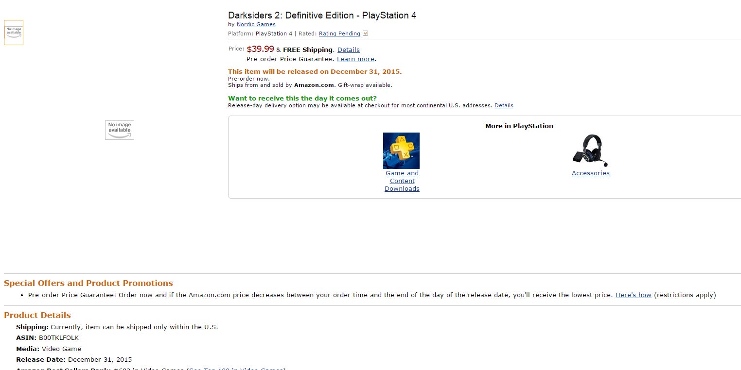 ORIGINEEL: Webwinkel Amazon heeft een productpagina geopend voor Darksiders 2: Definitive Edition, een PlayStation 4-titel die verder nog niet officieel is aangekondigd. De game kost daar omgerekend 35 euro en zou dit jaar nog uit moeten komen.