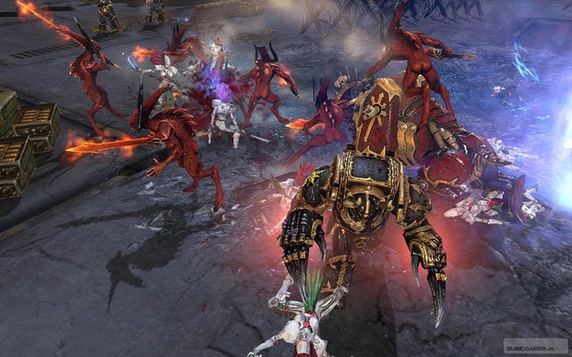 Helemaal vergeven van de nieuwe units is het nieuwe leger, de Chaos Marines. Die arriveren op hun inter-dimensionaal reizende schipplaneet om de huidige keizer van de mensheid af te zetten. Ze spelen ruwweg hetzelfde als de oude Space Marines, maar verleggen de focus van brute kracht richting stealth, hinderlaag en vreemdheid. De Chaos Marines zijn bezeten door demonen, zie je, en dat moet ergens in hun voordeel werken. Hun leger bestaat uit karikaturen van Space Marines, en verschijnen op het slagveld samen met enkele van hun demonische geallieerden. De Bloodcrushers, Chaos Marines op de rug van een hels nijlpaard, springen het meest in het oog. Afhankelijk van de Commander die je selecteert, bouw je met de Chaos Marines één van drie mogelijke schrijnen aan donkere goden, die elk andere abilities meegeven aan het leger. De allergoedkoopste unit van dit nieuwe leger, de Heretic, is een polyvalent kereltje dat misschien best dienst doet als kanonnenvoer, maar daarnaast ook kan bidden aan de schrijnen. Dan pas komen er abilities beschikbaar.