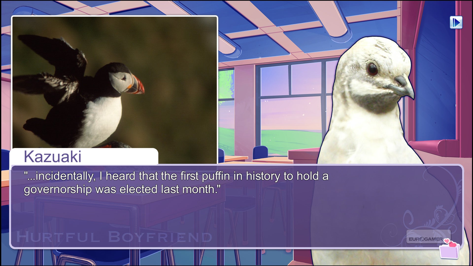 Vreemd genoeg raak je al snel gewend aan het gekke idee van een liefdevolle relatie tussen een man en een vogel. Hatoful Boyfriend is een geniale parodie van de populaire Japanse dating sims, maar los daarvan is het ook gewoon een goede game met een stevig verhaal.