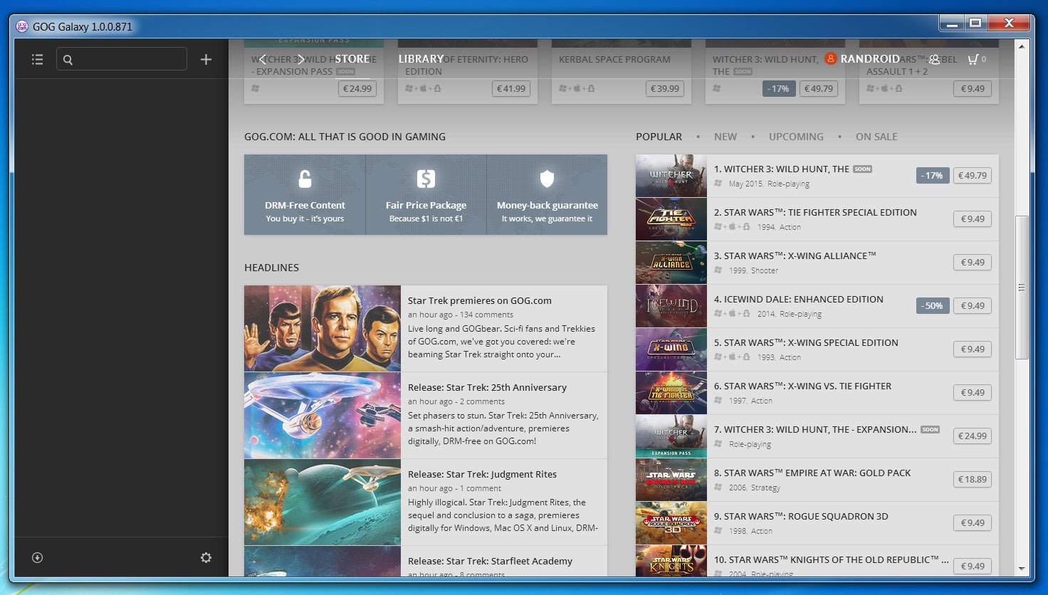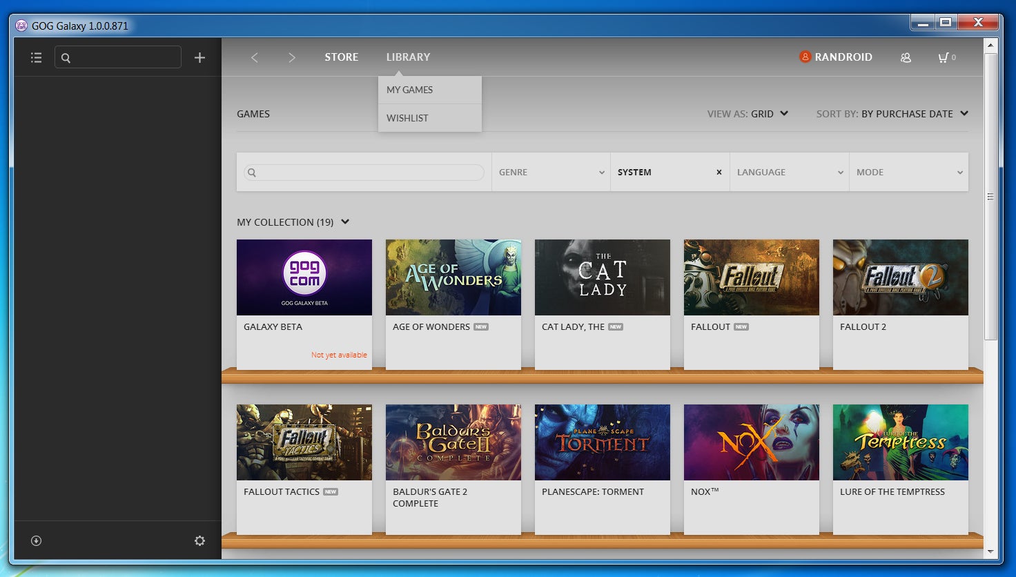 Sinds gisteren nodigt webwinkel GOG.com iedereen uit om zijn client GOG Galaxy uit te proberen. De software biedt een verzameling van de games die je hebt gekocht op GOG.com, waar vanuit je ze ook direct kan spelen. Daarnaast heeft het een winkelpagina en een vriendenlijst, vergelijkbaar met Steam. De bèta release ziet er als volgt uit.