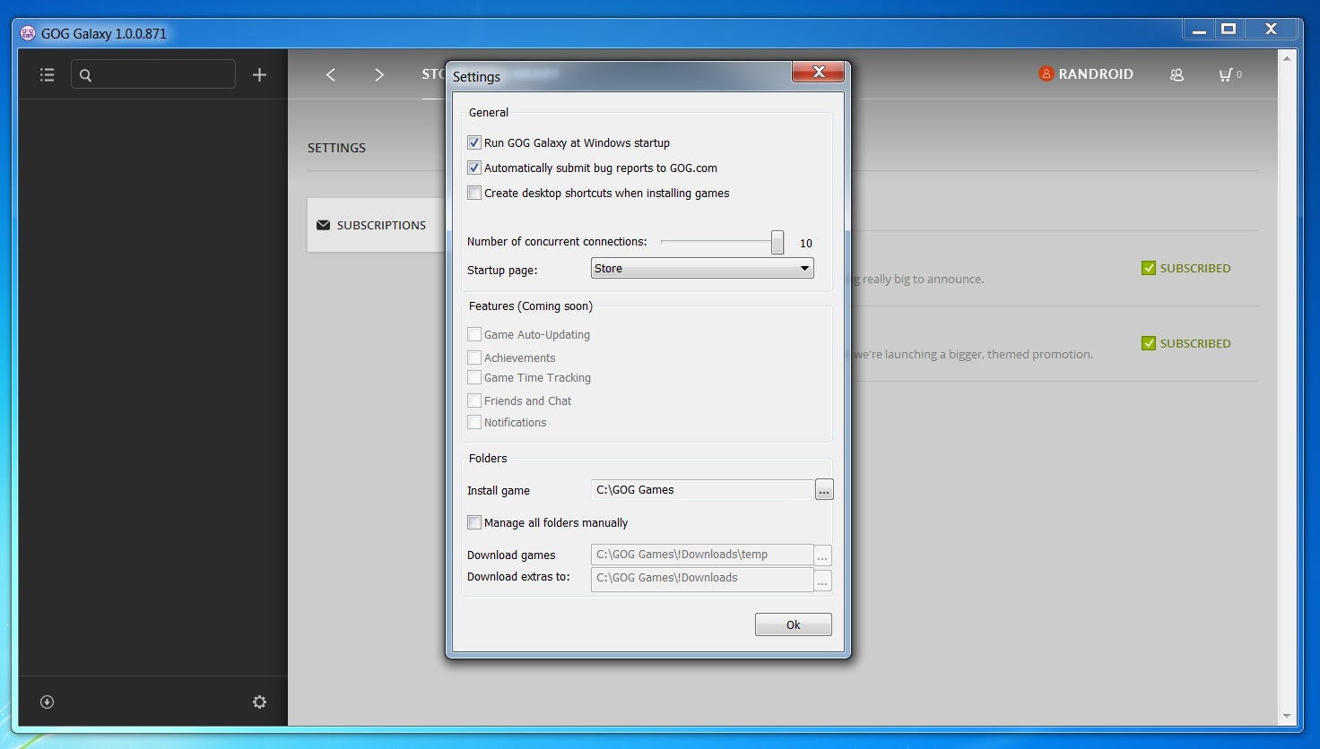 Tot slot dan nog even de settings. Duidelijk wordt dat in deze bètaversie nog niet alles werkt, zoals het automatisch laten updaten van games. Maar zodra het kan, kun je dat hier weer uitzetten als je wilt. Je kan er ook bepalen of het programma mee opstart en waar de gekochte games geïnstalleerd worden.