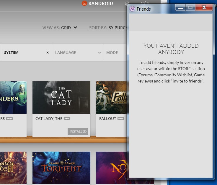 Je vriendenlijst dan. Hier kleeft vooralsnog een nadeel aan: je kan niet zomaar iemand op gebruikersnaam toevoegen. Degene waar je vrienden mee wilt zijn, moet actief zijn op het forum of een review hebben achtergelaten. Het kan bijgevolg een flinke klus zijn om degene te vinden die je zoekt. Hoe het er uit kán zien, zie je in de tweede screenshots hieronder. Heb je GOG Galaxy net geïnstalleerd, dan zie je dit: