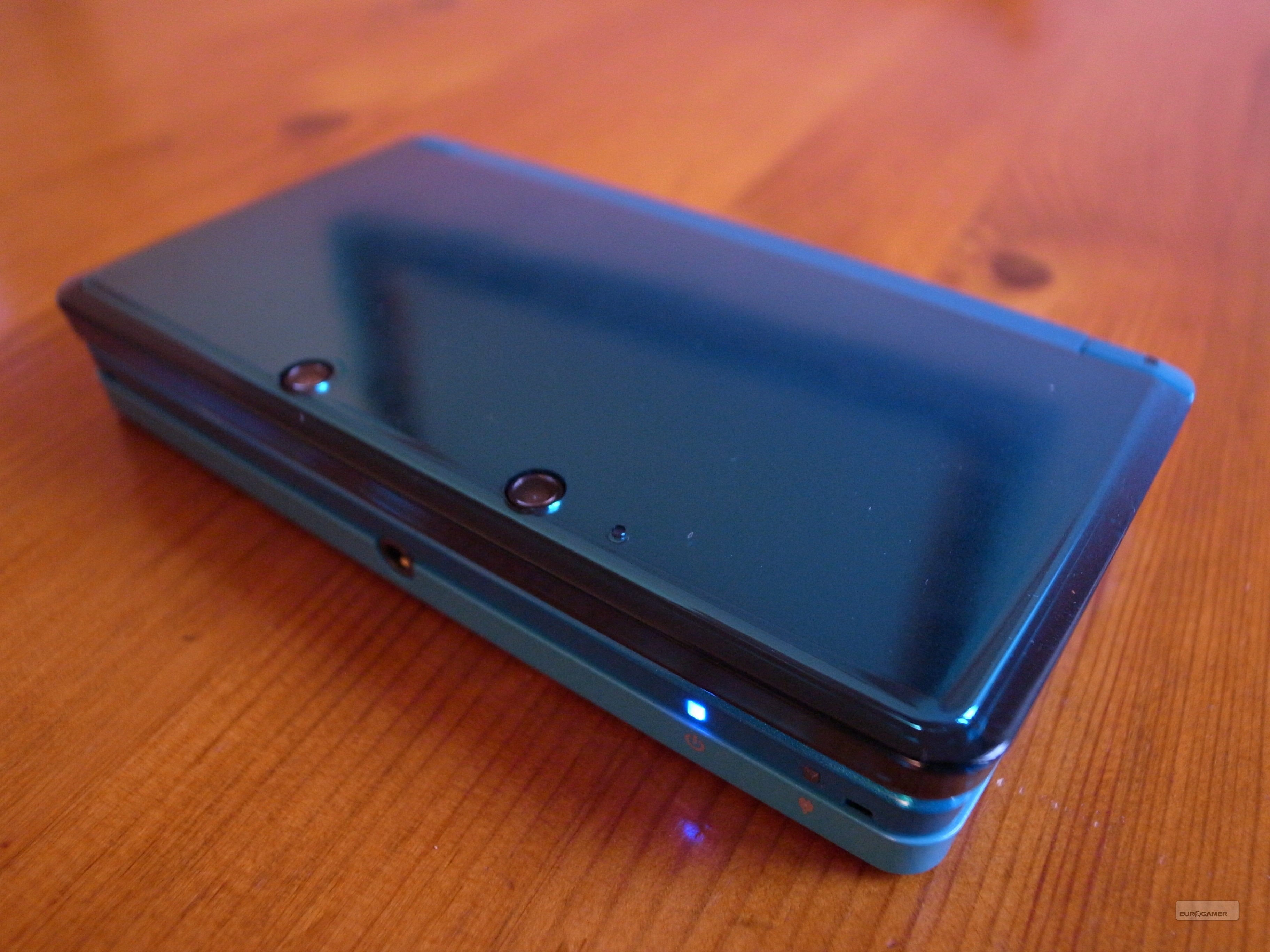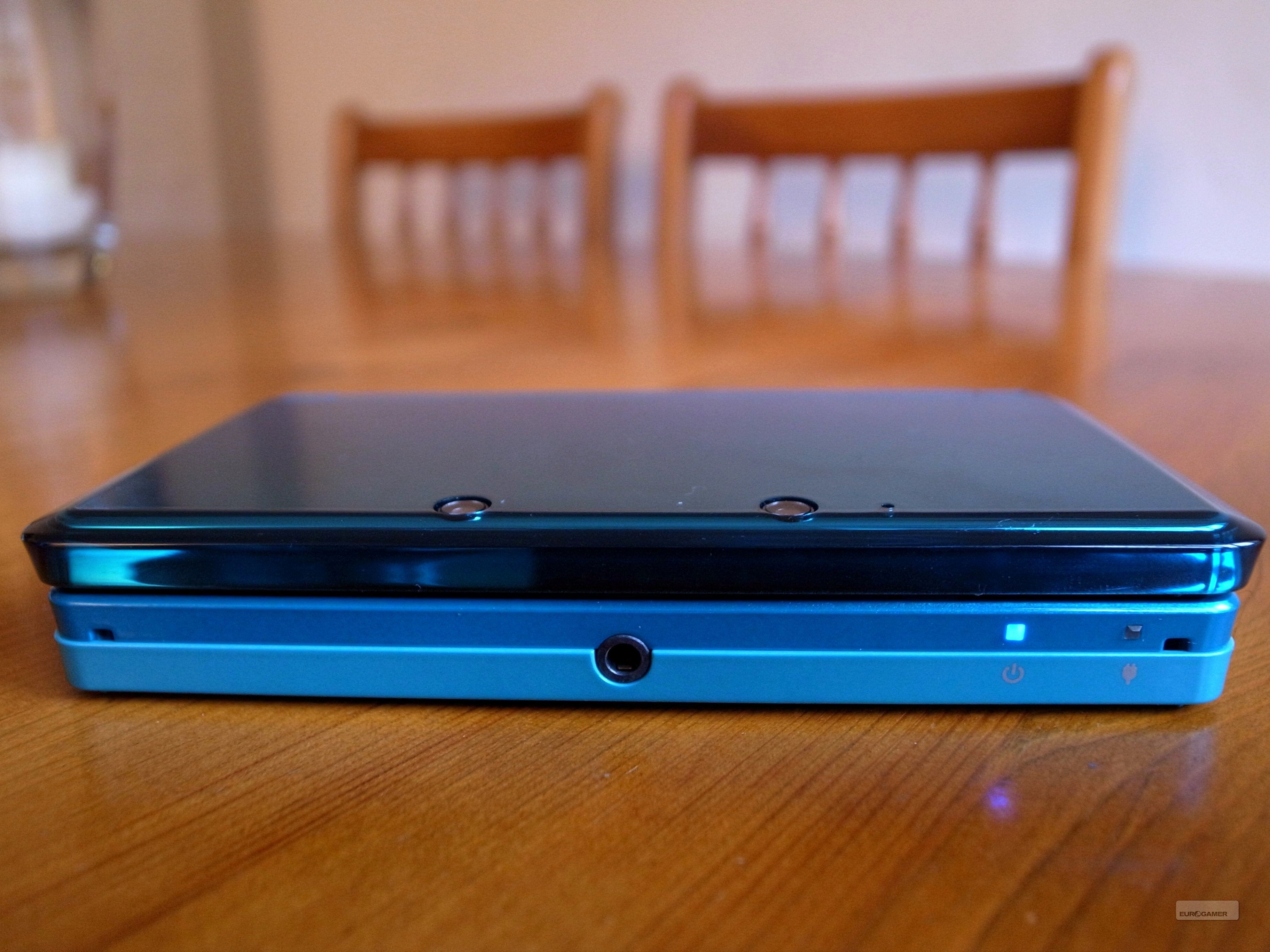 De bovenkant van de 3DS is netjes afgewerkt met een blinkende, gladde verflaag. Deze zal naargelang je eigen keuze zwart, of azuurblauw zijn. Ga je voor de laatste optie, dan ziet de 3DS er speels en jeugdig uit. Kies je voor de zwarte versie, en haal je een volwassen en trendy apparaat in huis. Belangrijk om weten is dat de zwarte editie gevoeliger lijkt te zijn voor vingerafdrukken dan de azuurblauwe. Een al te groot probleem is dit echter niet gezien deze makkelijk met een vodje verwijderd kunnen worden. Zelfs je mouw of T-shirt is een goede optie om vingerafdrukken weg te vegen, want het ziet ernaar uit dat de 3DS zelfs dan relatief krasvrij blijft. Het is ons alvast nog niet gelukt om ook maar één krasje op de handheld te laten verschijnen, en dat na er een week voor het schrijven van dit artikel dagelijks aardig wat uren mee gespeeld te hebben. Verder zijn er twee camera's aan de bovenkant te vinden die minder prominent aanwezig zijn dan die op de DSi. Waarom het er twee zijn leggen we jullie wat verder in dit artikel uit.