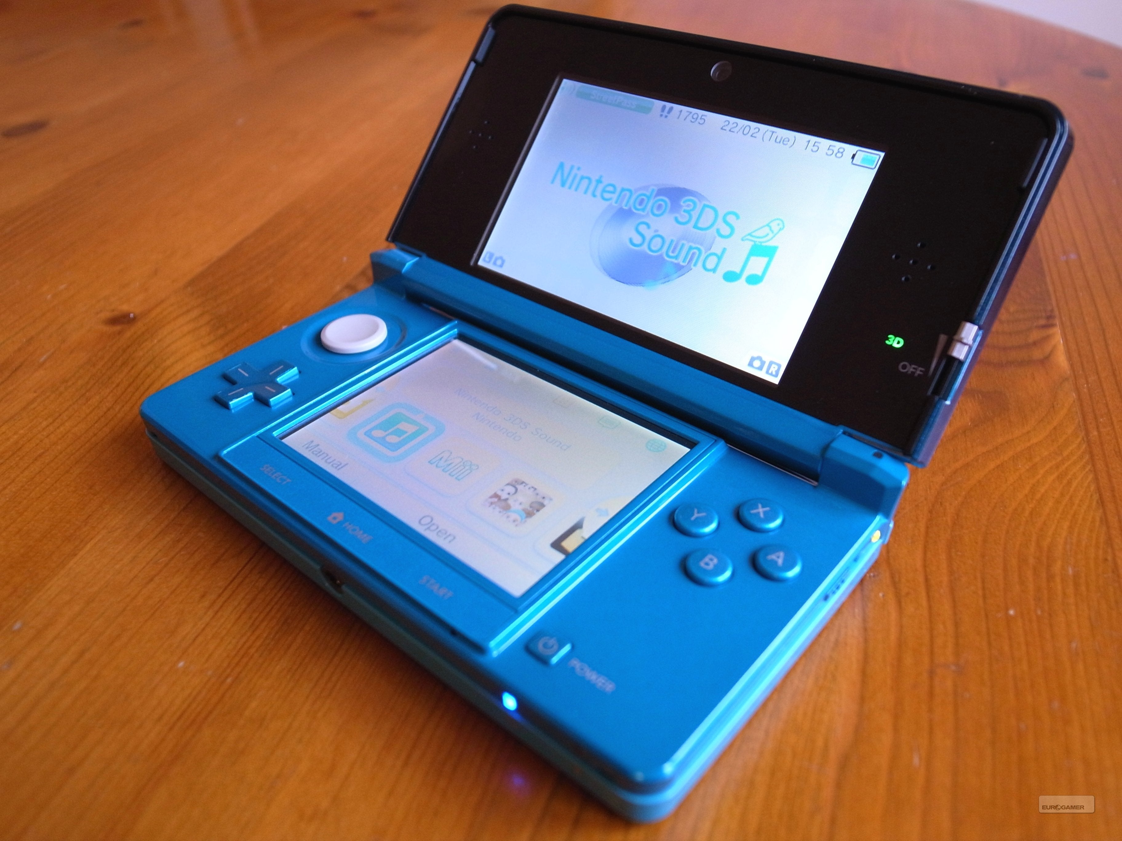 Klik je de 3DS open, dan merk je onmiddellijk dat het scherm netjes vastklikt zonder dat je daarbij een ongezond klikgeluid hoort. In tegenstelling tot de DSi voelt het aan alsof de handheld veel natuurlijker openklikt. Het is echter nog steeds mogelijk om het scherm helemaal naar achteren te plooien, waardoor je 3DS opengeklapt loodrecht is. Het bovenste scherm, waarop de 3D-beelden dus weergegeven worden, is een slordige centimeter groter dan het onderste touchscreen. Er zitten bovendien ook geen zwarte randen rond, wat de oppervlakte van de weergave nog groter doet aanvoelen. Aan de linker-en rechterkant van het scherm zitten twee luidsprekers waardoor de audio kan komen. Opnieuw zie je de 3D-slider, maar wanneer je de 3DS openklapt krijg je ook een visuele indicatie wanneer je games in 3D aan het spelen bent. Op dat moment zullen de letters '3D' namelijk groen oplichten. Bovenaan het scherm zit alweer een camera die foto's van je gezicht kan nemen.